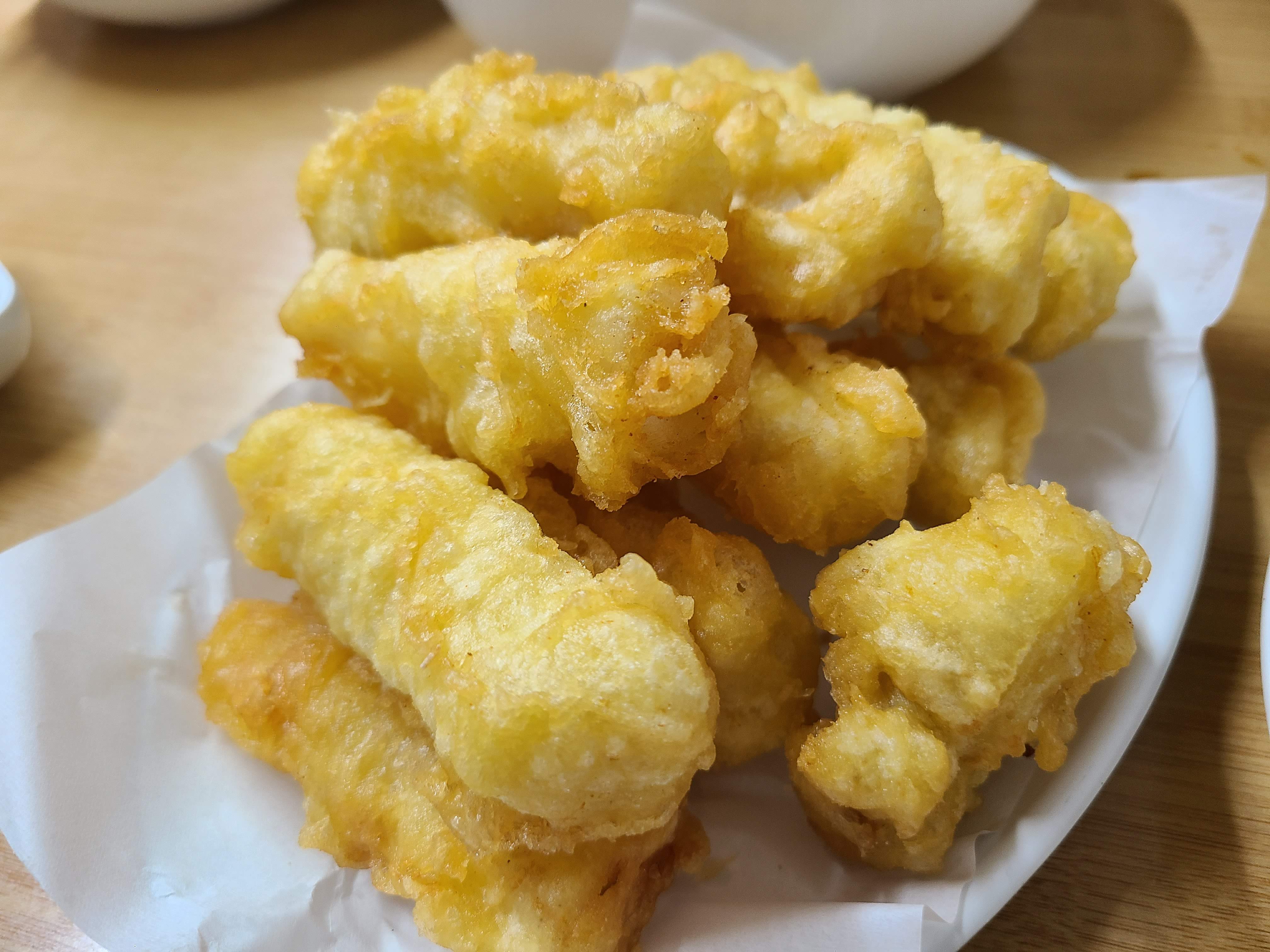 여기에서 가장 맛있는 것은 칼국수이지만 생선튀김도 아주 맛있습니다.