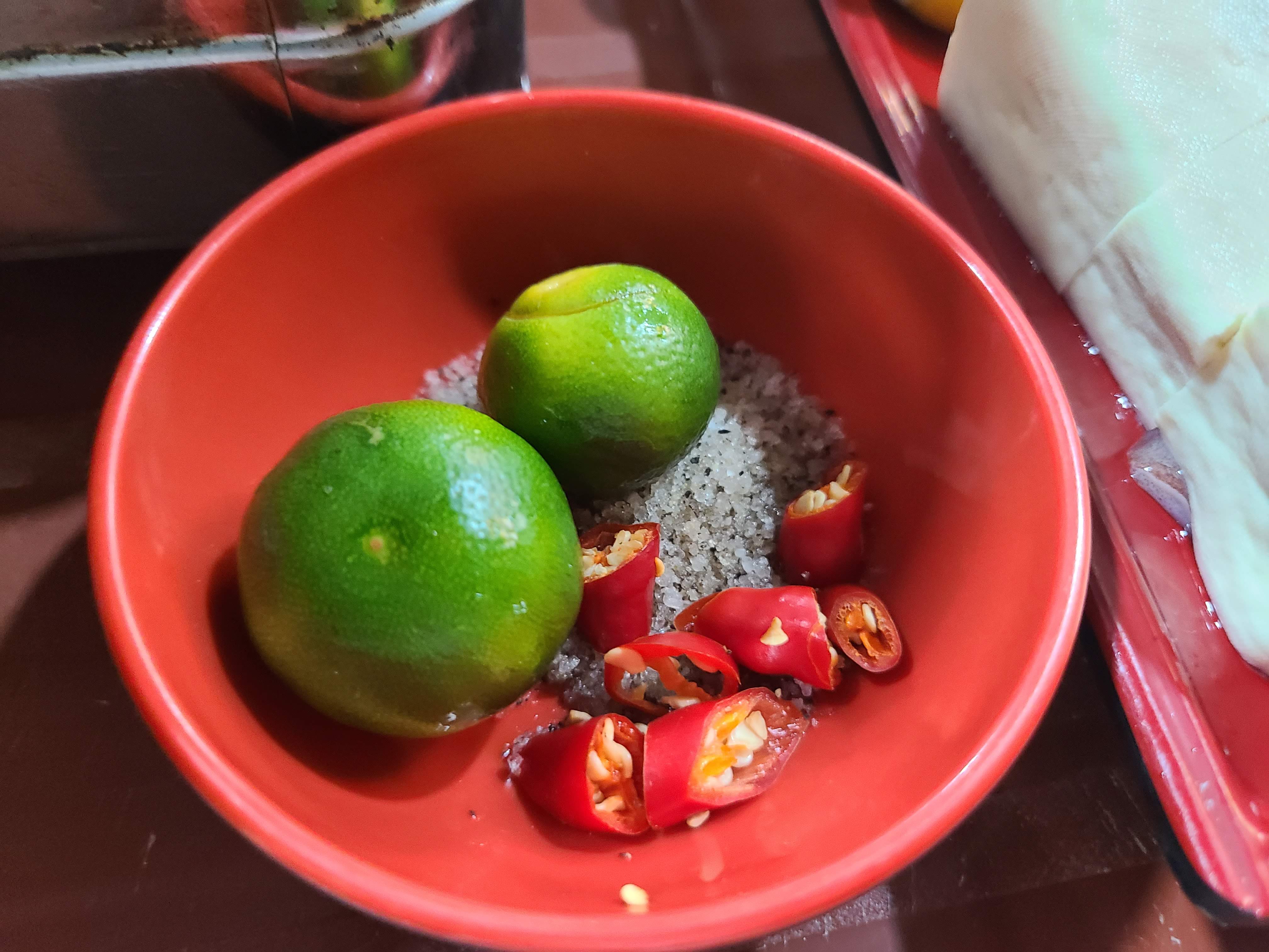 음식을 찍어 먹으라고 나온것입니다. 레몬(?)을 짜서 찍어 먹으라고 하는 것입니다..