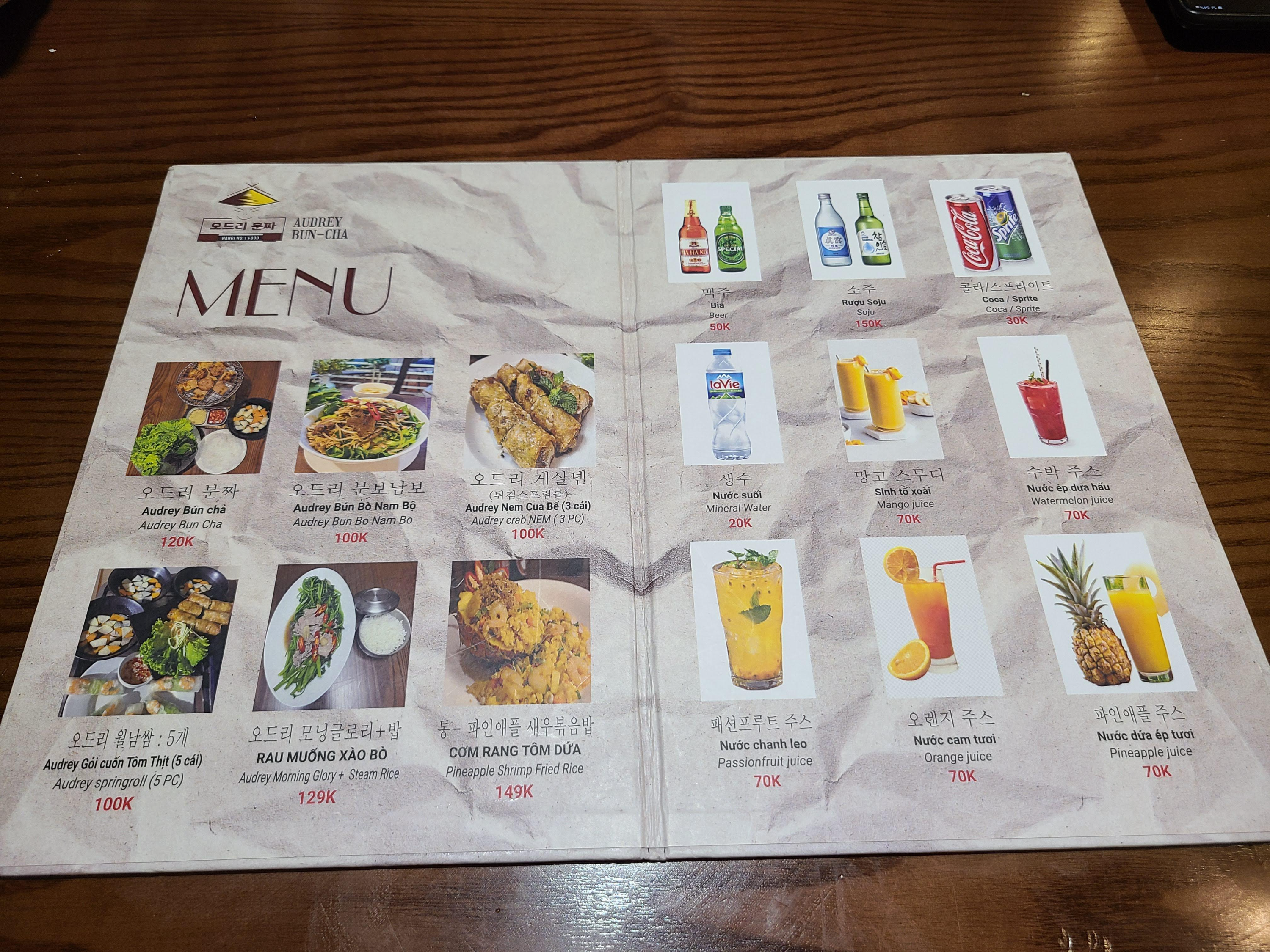 저는 여기에서 망고주스, 사이공맥주, 오드리분짜, 오드리분포남보, 통-파인애플 새우볶음밥을 주문하였습니다.