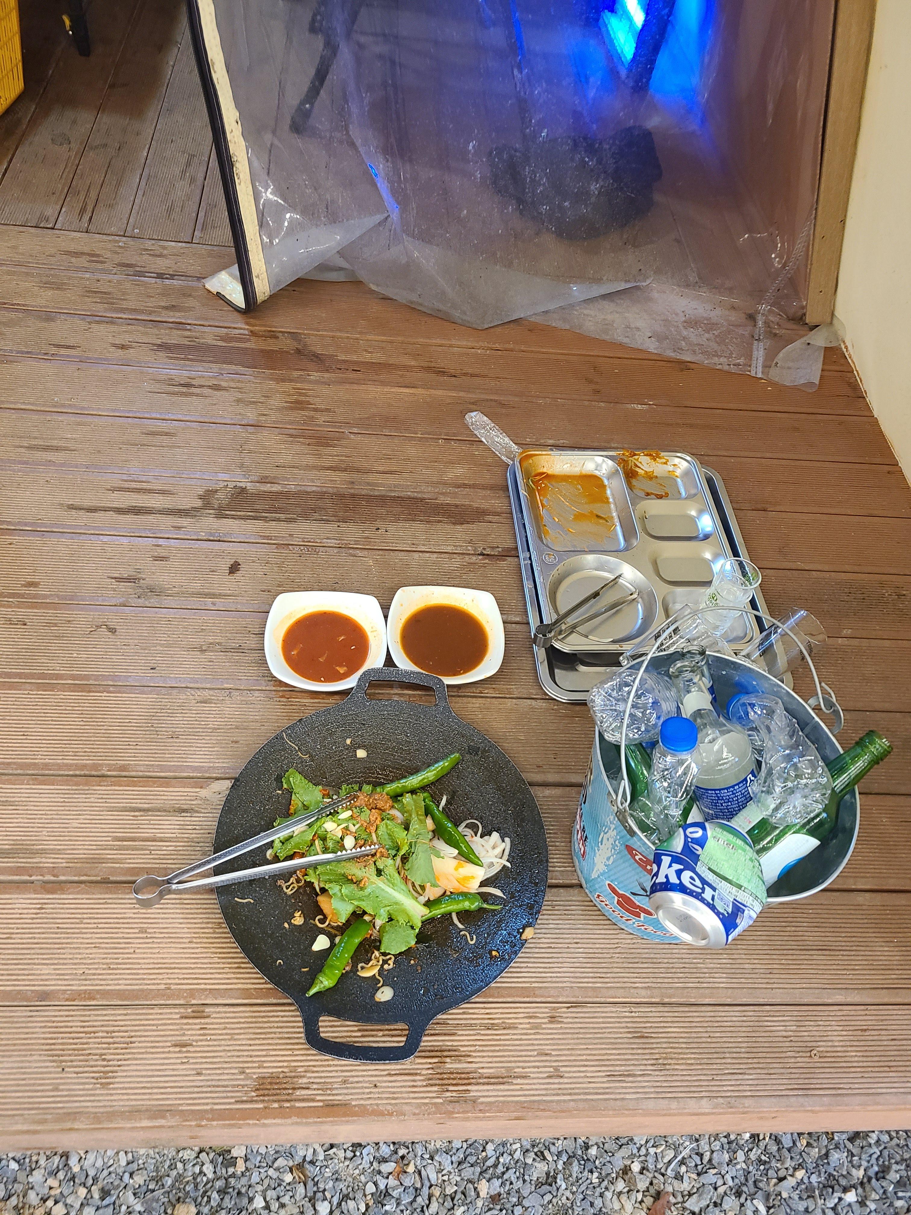 고기를 먹고 난 다음에 라면을 먹었습니다. 라면을 먹을 수 있는 냄비가 주워지지만, 어디서 본 것이 있다고 삼겹살 구워 먹던 곳에 먹었습니다.