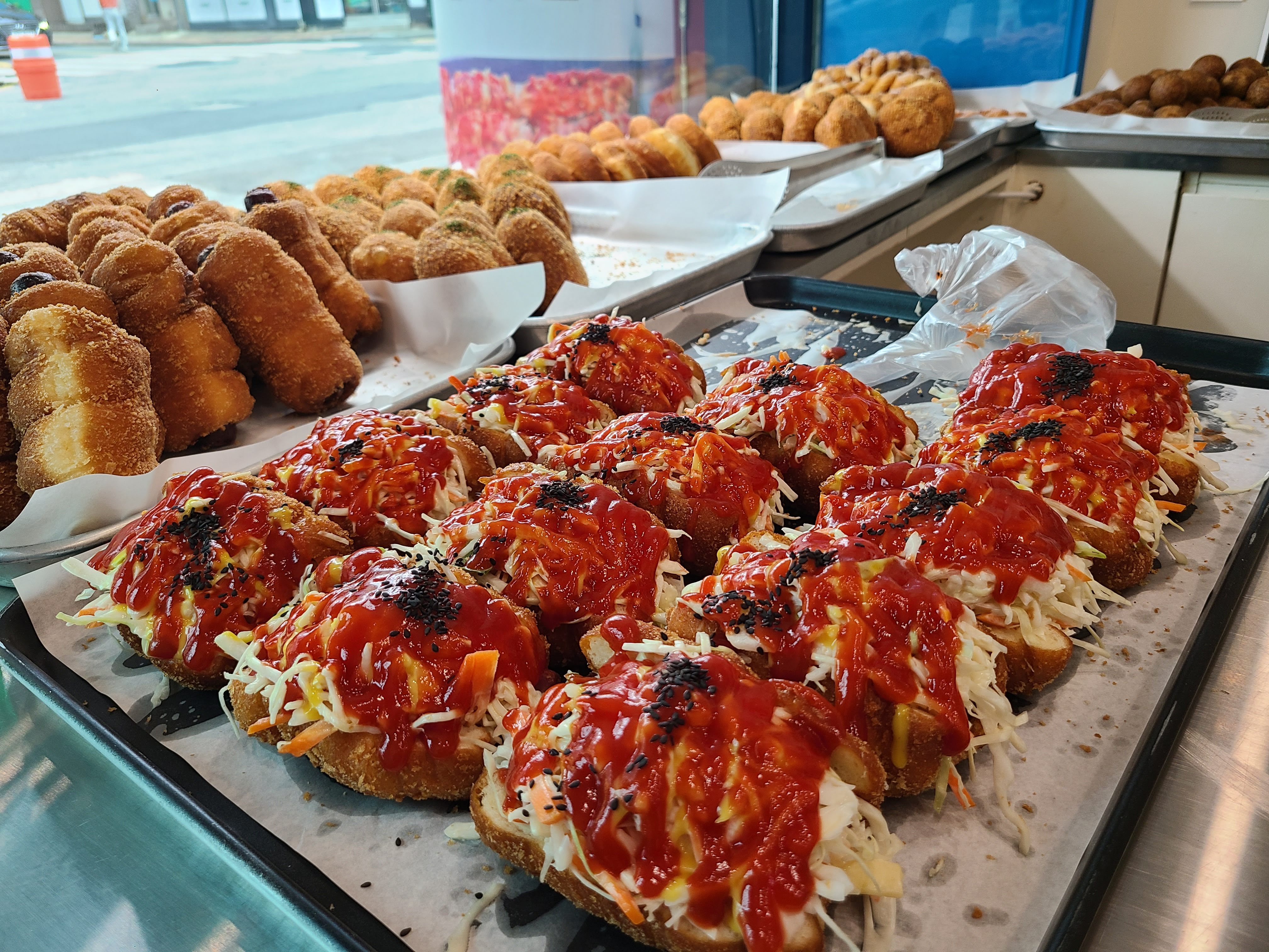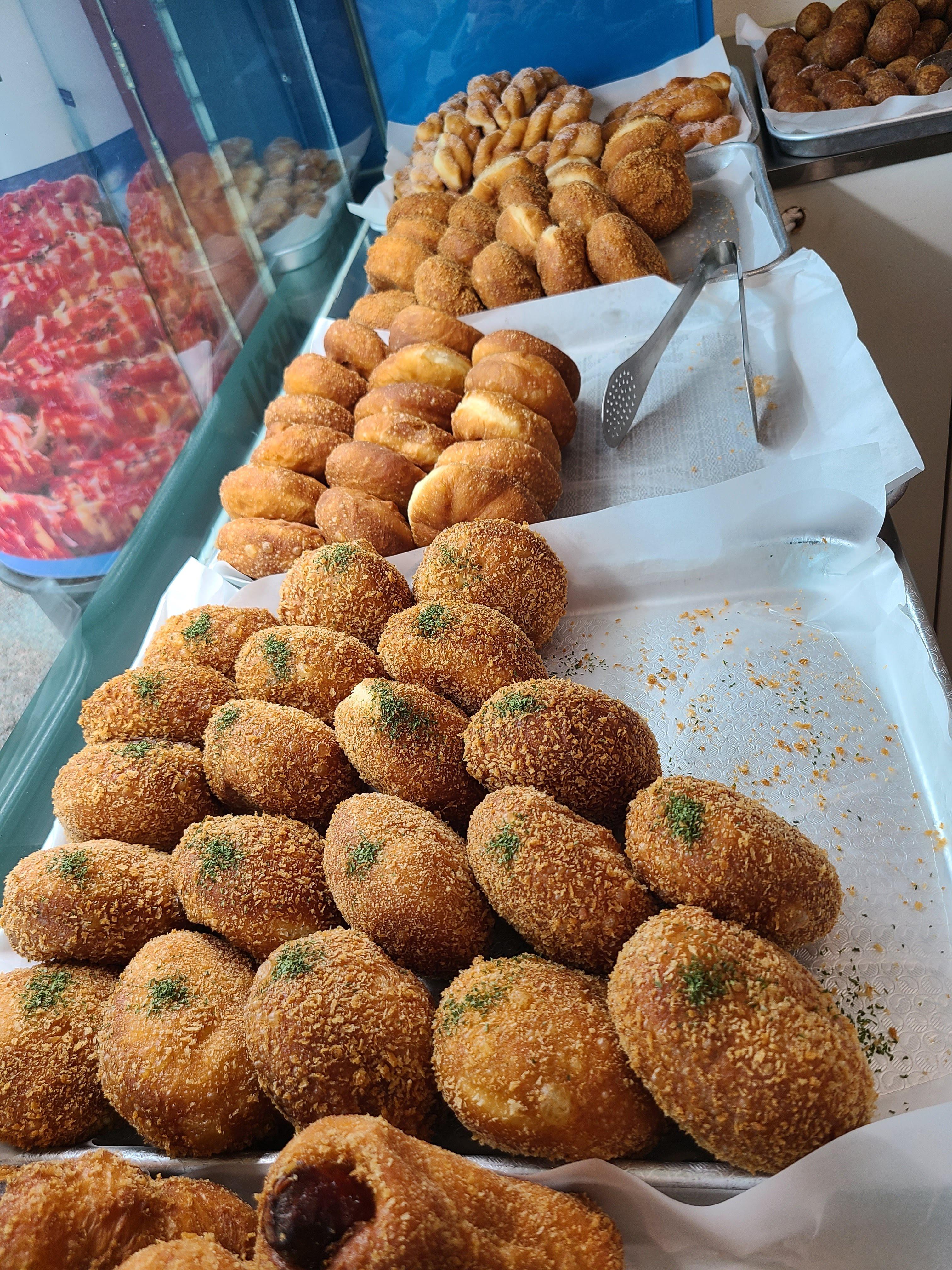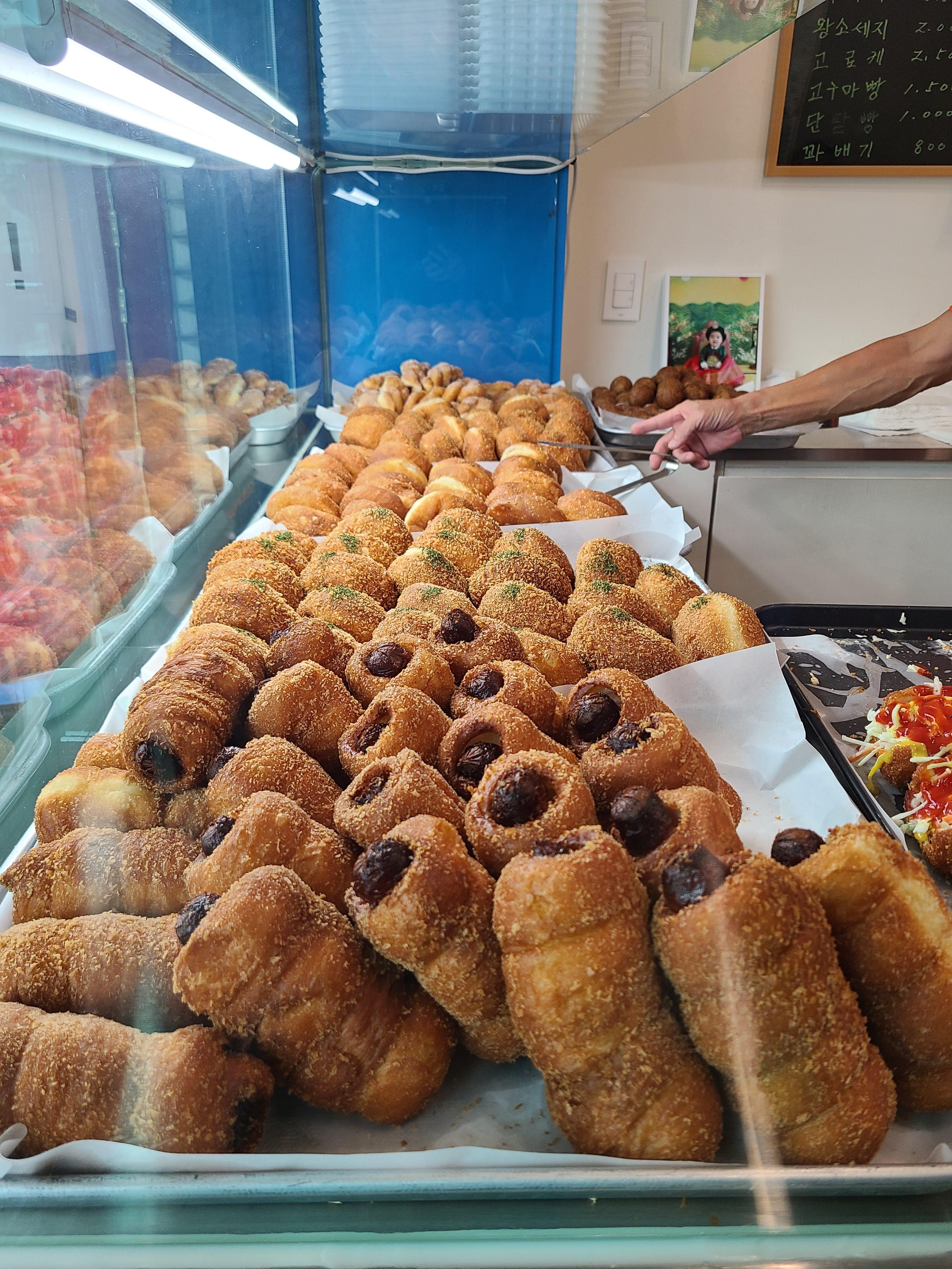 저는 여기에서 사라다 빵, 단팥빵, 야채고르케 그리고 찹쌀도너츠를 샀어요.