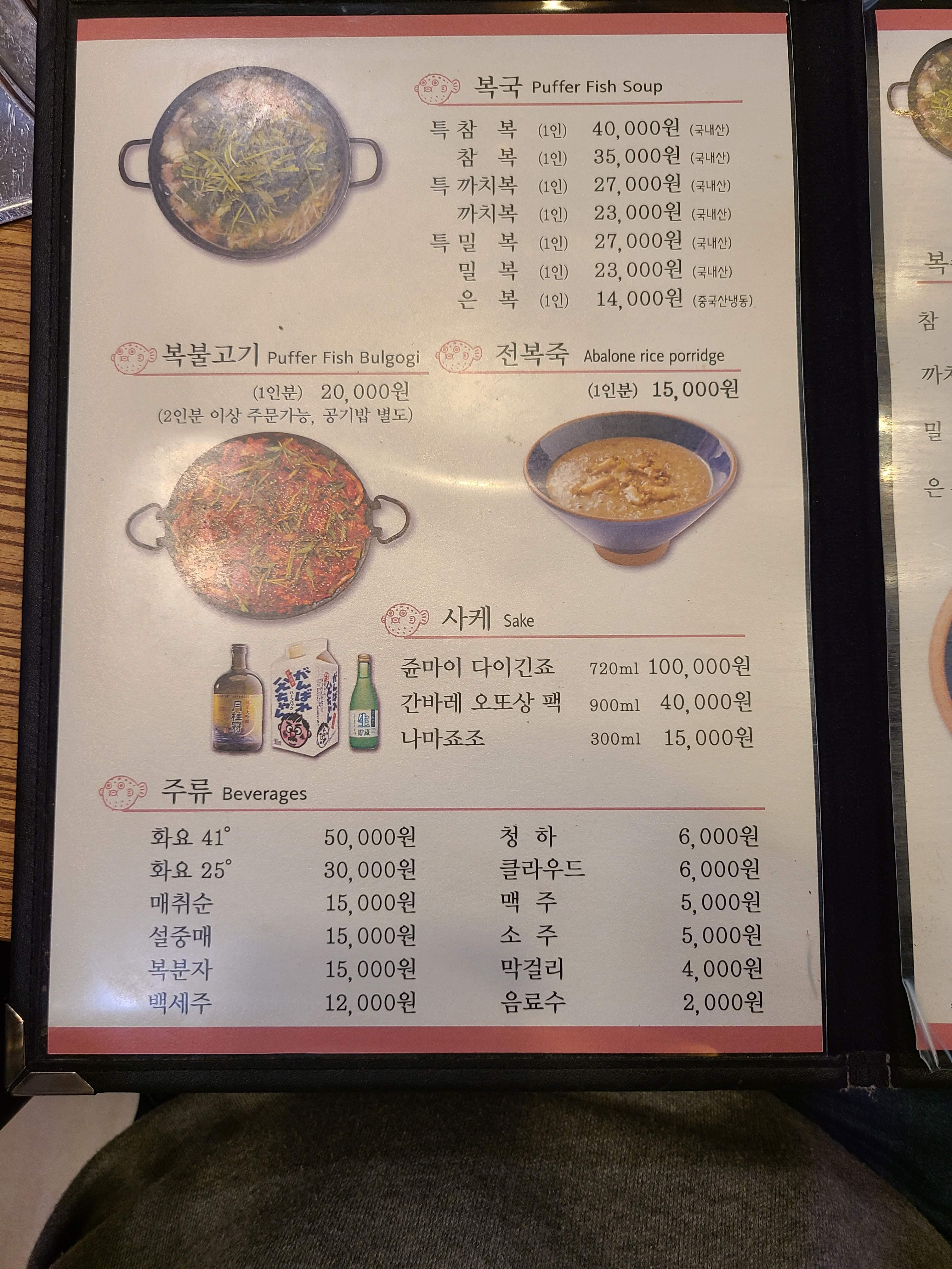 기억으로는 까치복을 먹은 것 같네요. 참복, 까치복, 밀복이 다 다르던데.. 어떻게 다른지는 잘 모르겠더라고요..