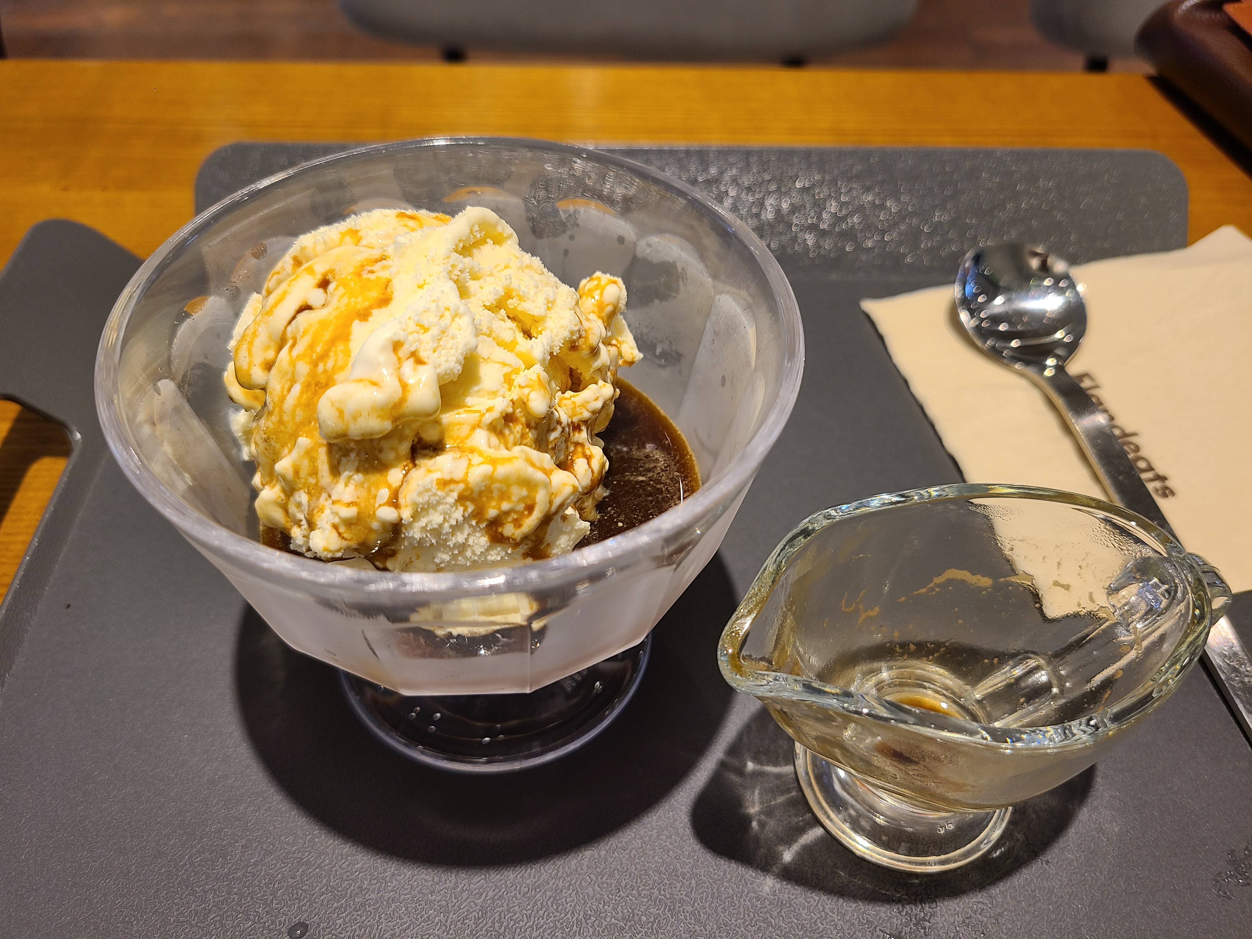 둔탁하지만 아이스크림은 바닐라 향이 진한 아이스크림입니다. 마트나 편의점에서 먹어보았던 아이스크림이고요 커피는 역시 에스프레소로 진합니다. 컵도 넓어서 커피가 흘리지 않고요 커피를 부어 먹을 때 서서히 녹이면서 먹을 수 있어서 좋습니다.