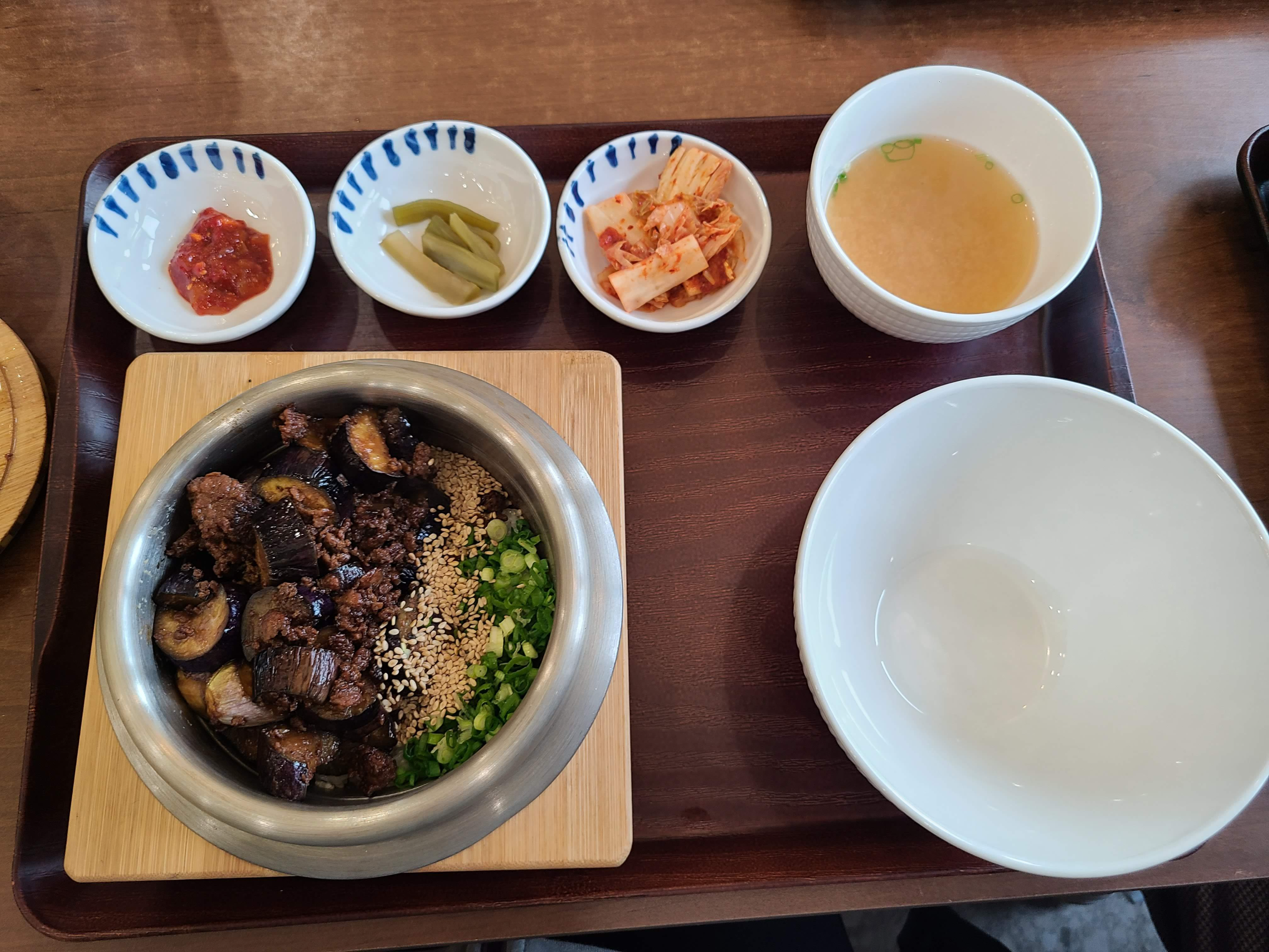 여러 음식이 있었는데 저는 가지 솥밥을 먹었습니다.