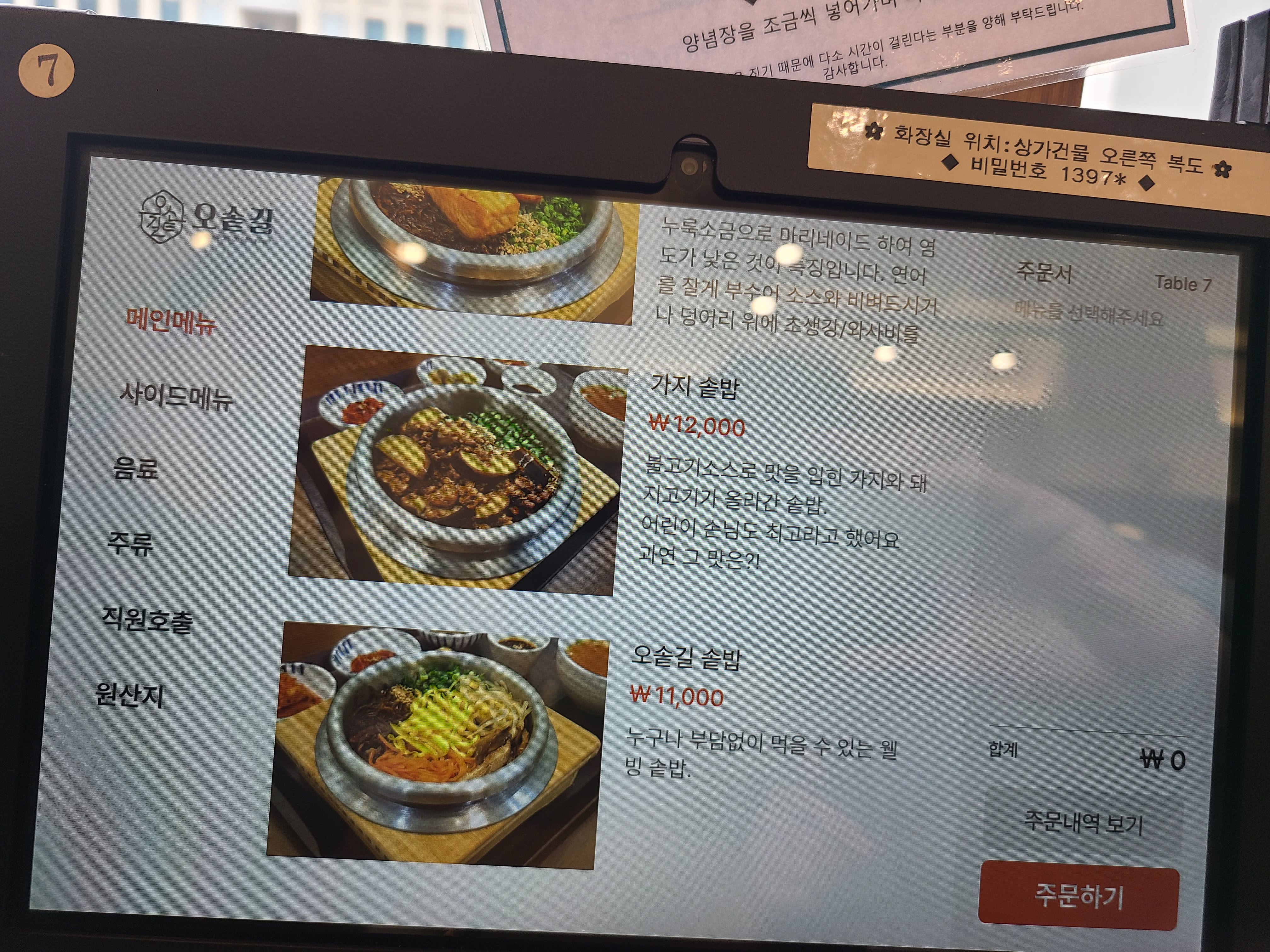 솥밥으로는 전복, 스테이크 연어, 가지 그리고 오솥길 솥밥이 있었는데, 저는 색다른 가지 솥밥을 선택했습니다.
