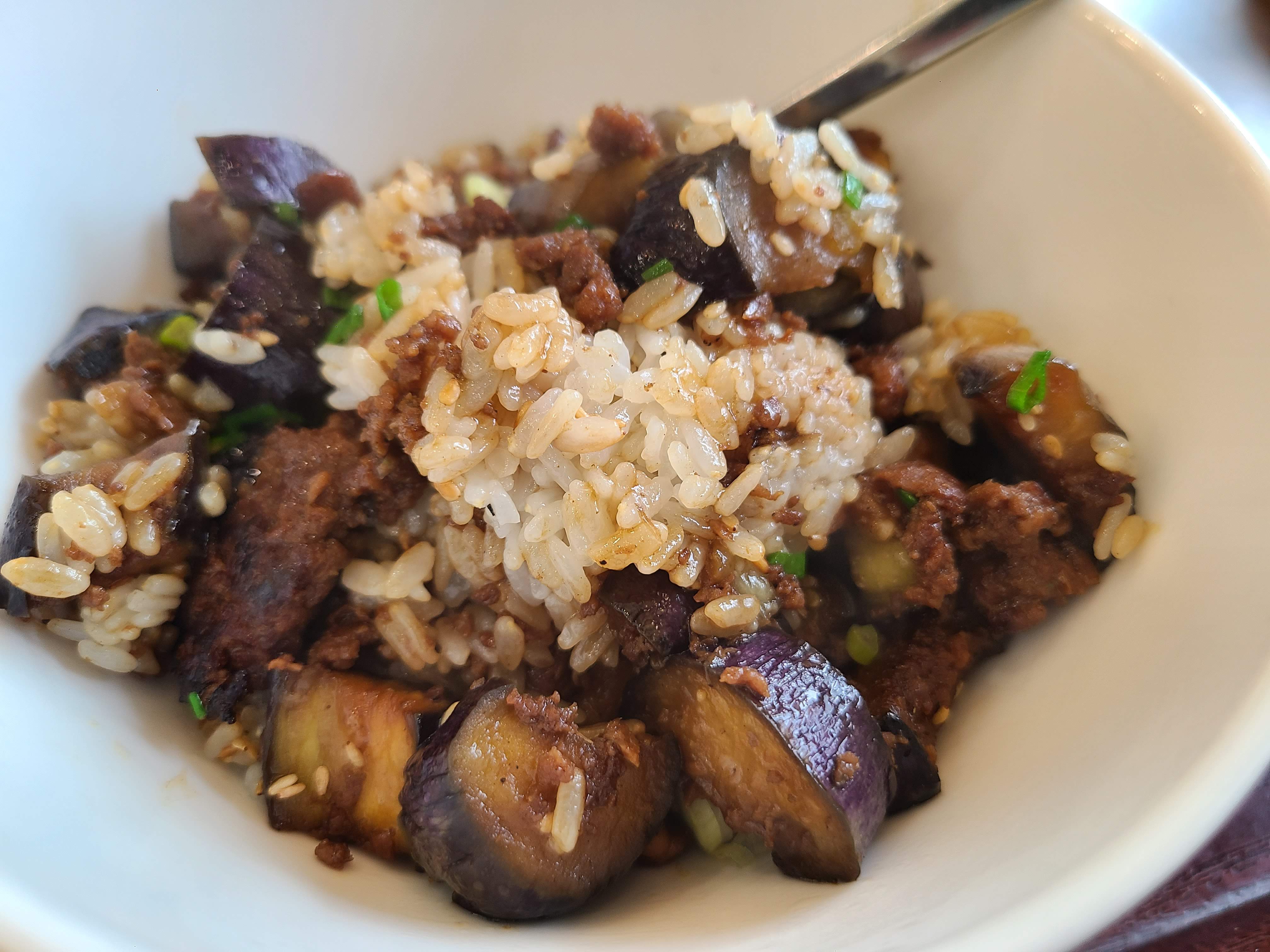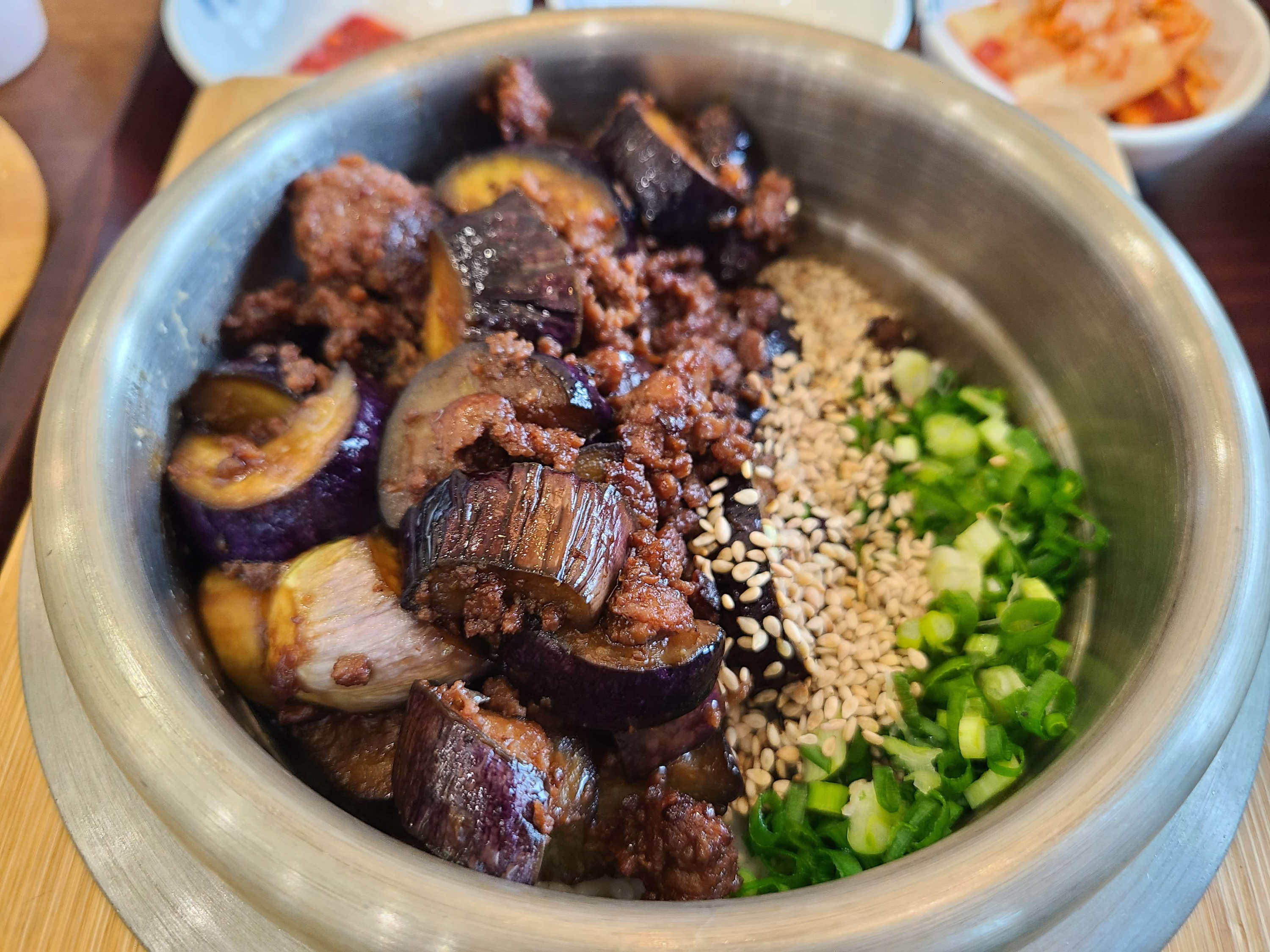 여러 음식이 있었는데 저는 가지 솥밥을 먹었습니다.