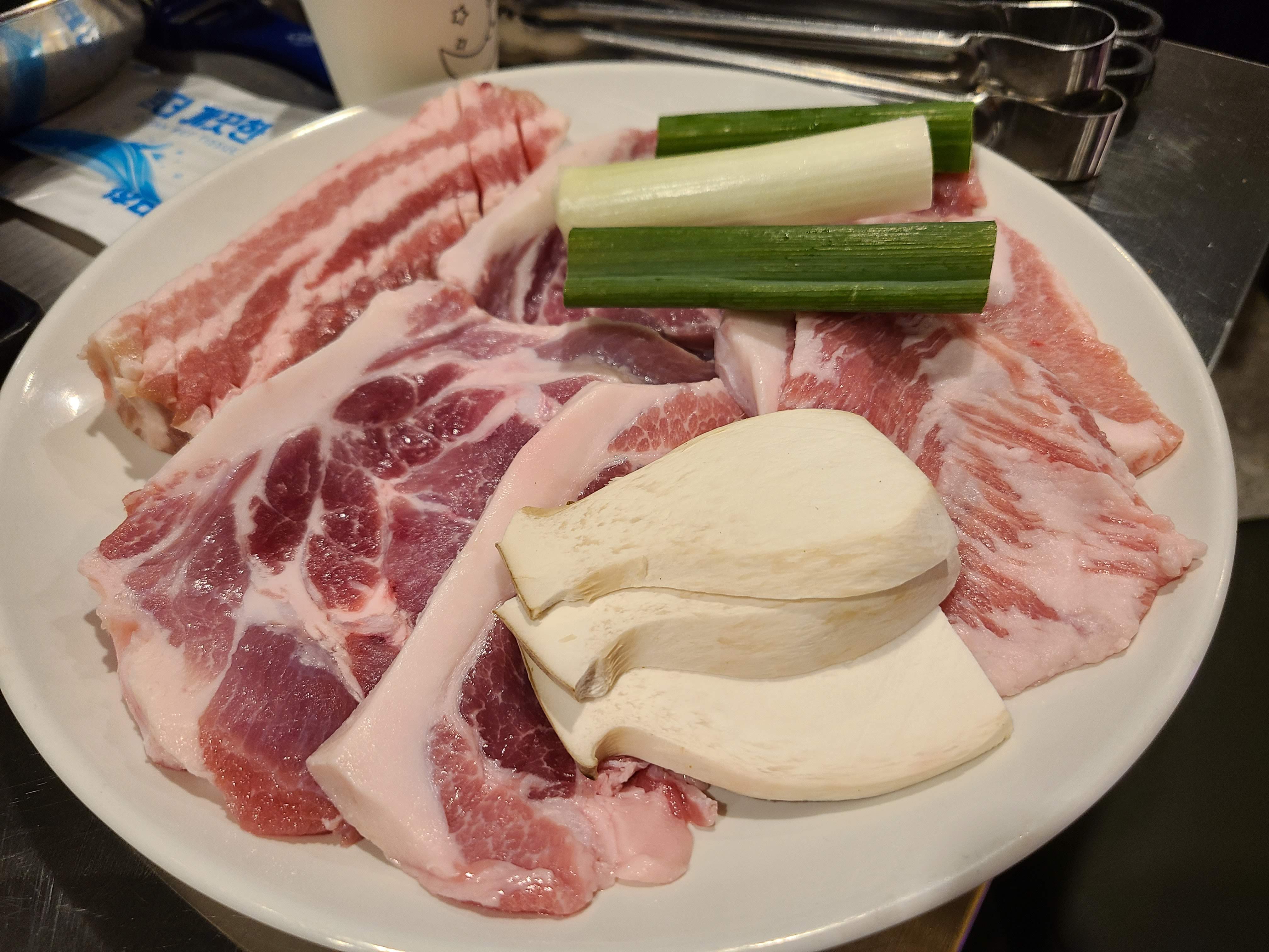 저는 도야지 한근을 주문했습니다. 삼겹살, 목살 그리고 항정살이 있습니다. 대파와 버섯도 있습니다.