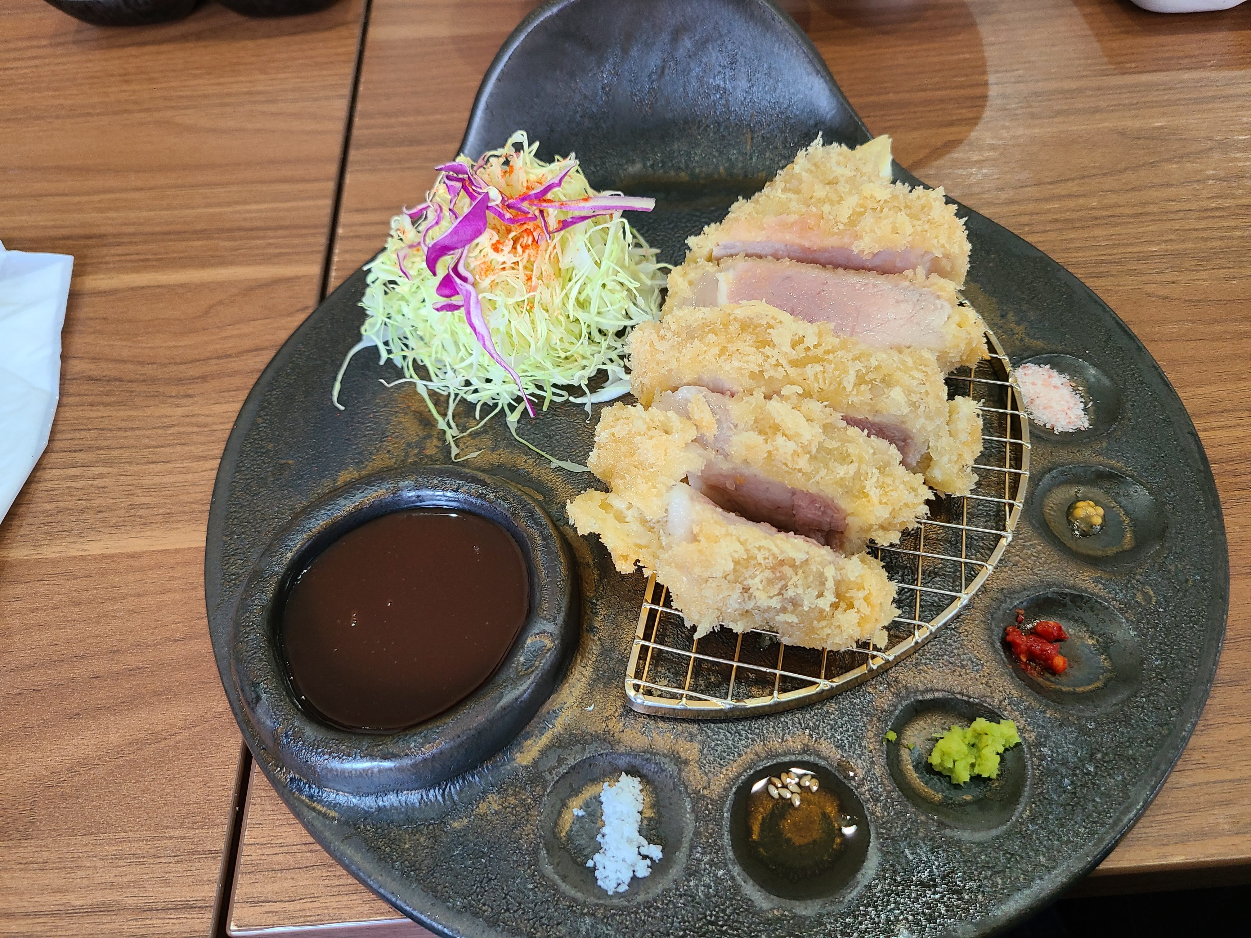돈까츠 입니다. 6가지의 소스가 나오는데 하나의 소스 하나씩 찍어 먹는 맛이 있습니다.
