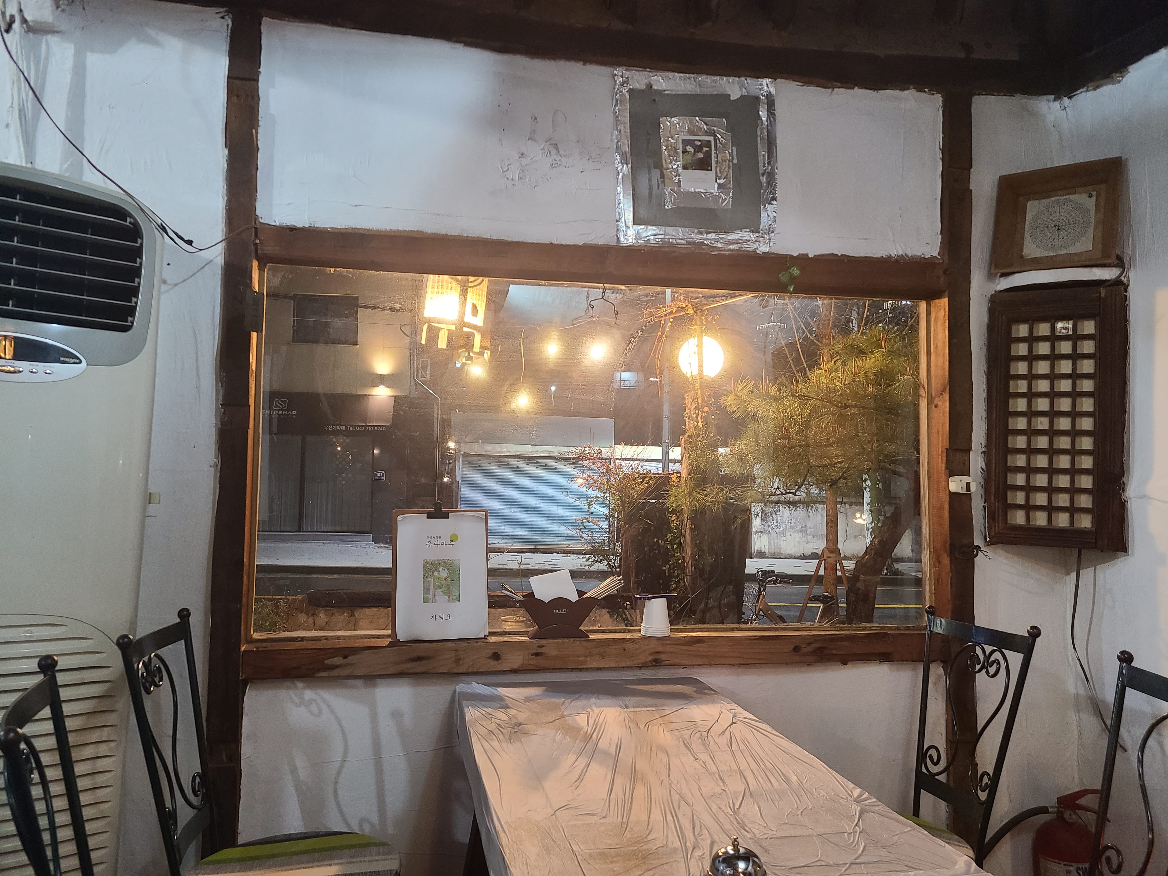 음식점의 자리에 앉아서 밖을 보면서 찍은 사진입니다.