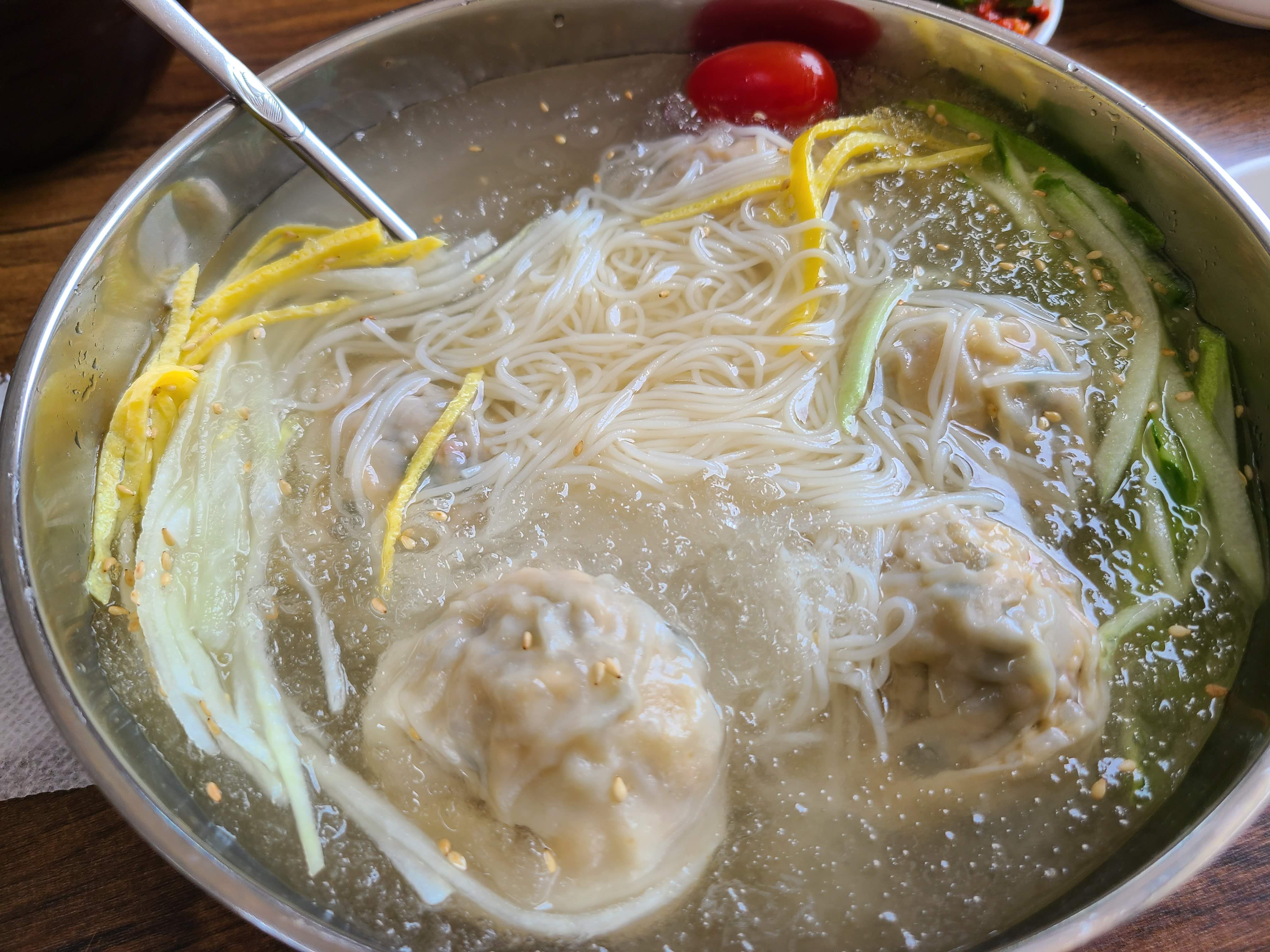 정말로 다른 경험이었습니다. 시원한 동치미 국물에 만두와 면을 함께 넣어 주셨어요. 면은 소면인데 면도 맛있습니다.