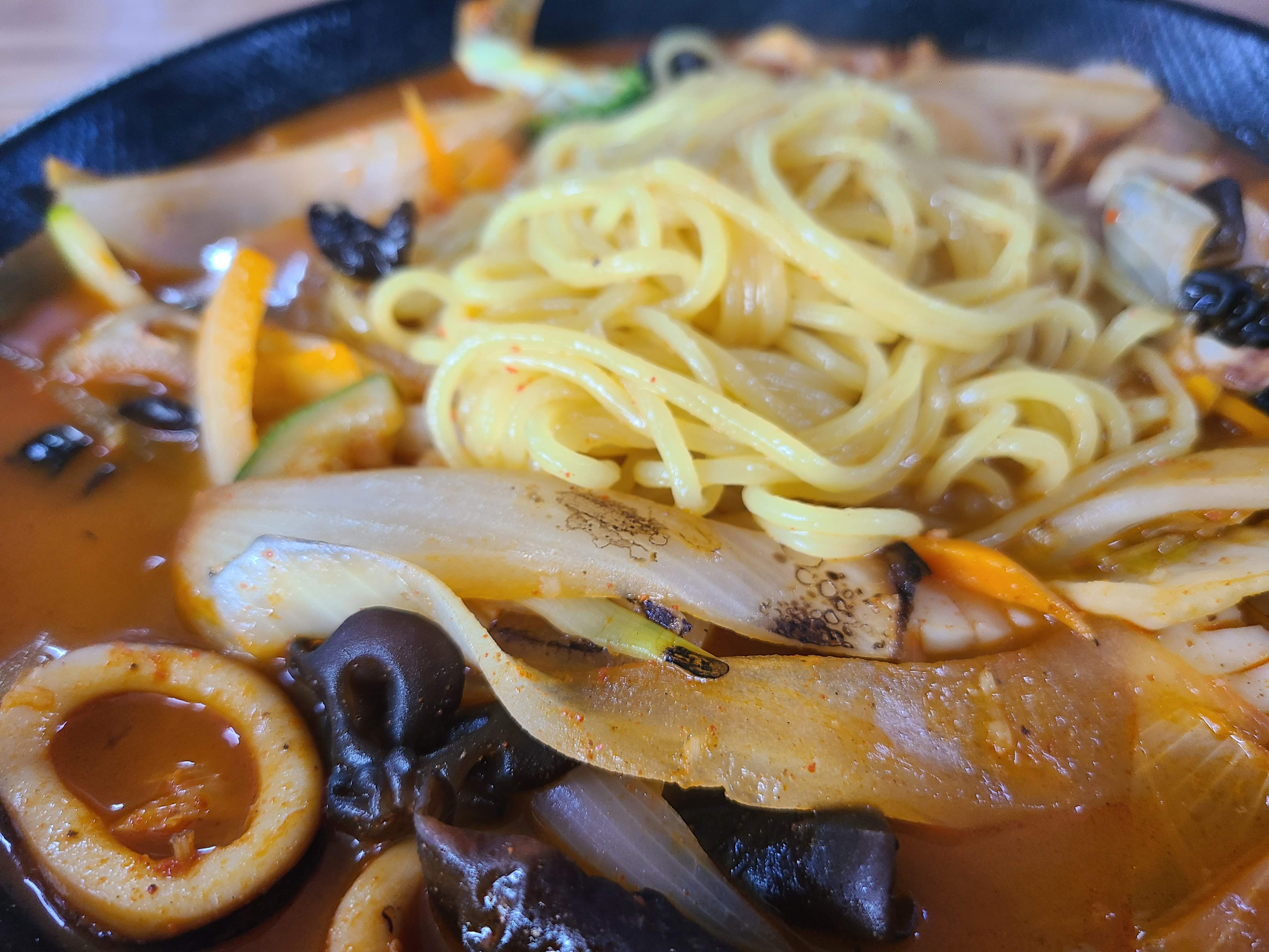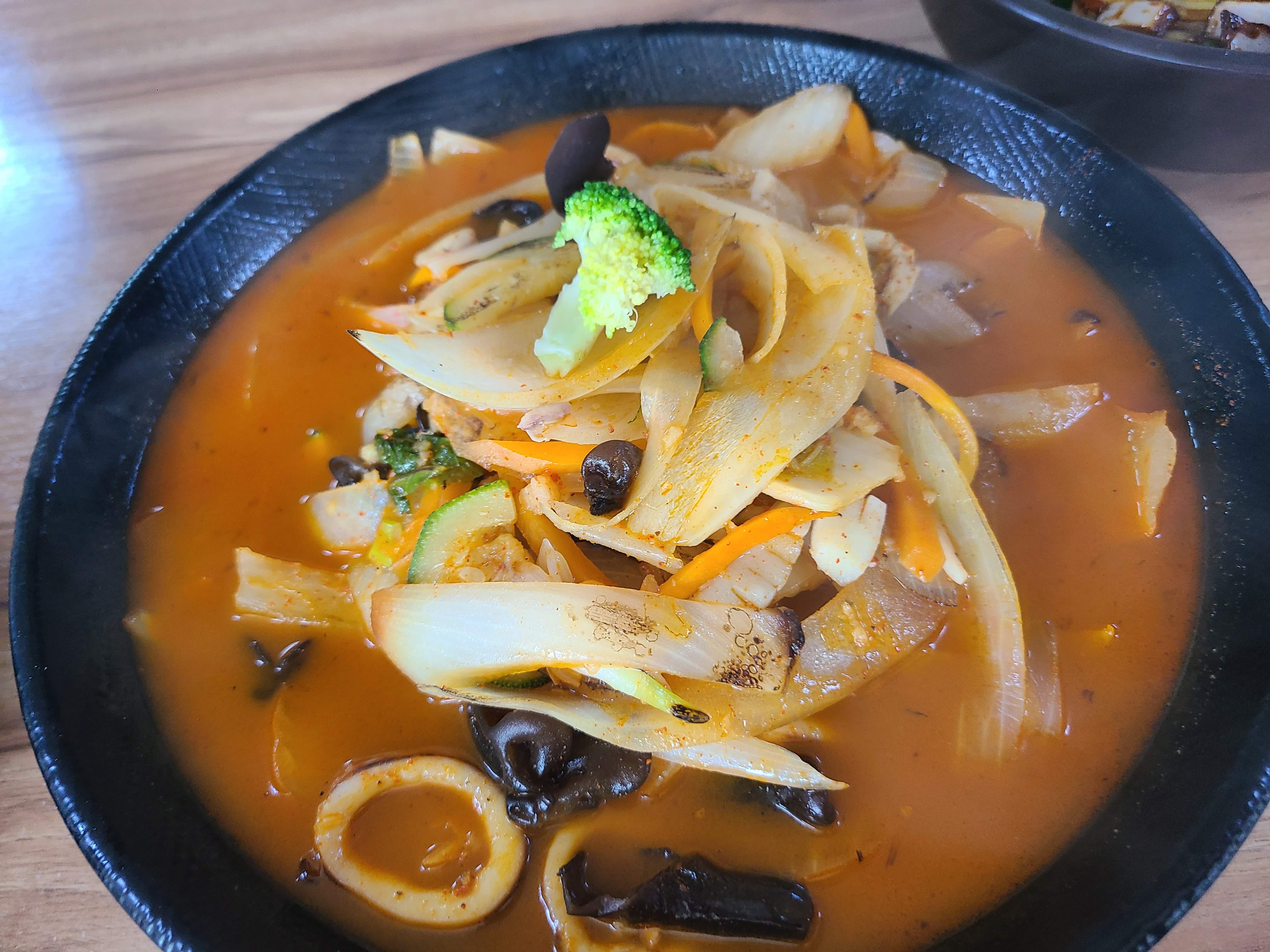 낭만짬뽕입니다. 처음에 국물을 먹게 되면.. 이게 뭐지.. 라는 생각이 들었어요. 짬뽕의 매운맛 보다는 묵직하면서도 가벼운(말이 되지 않지만..) 단맛이 느껴집니다. 맵지 않아요.. 하지만 짬뽕 특유의 느낌이 있어요.