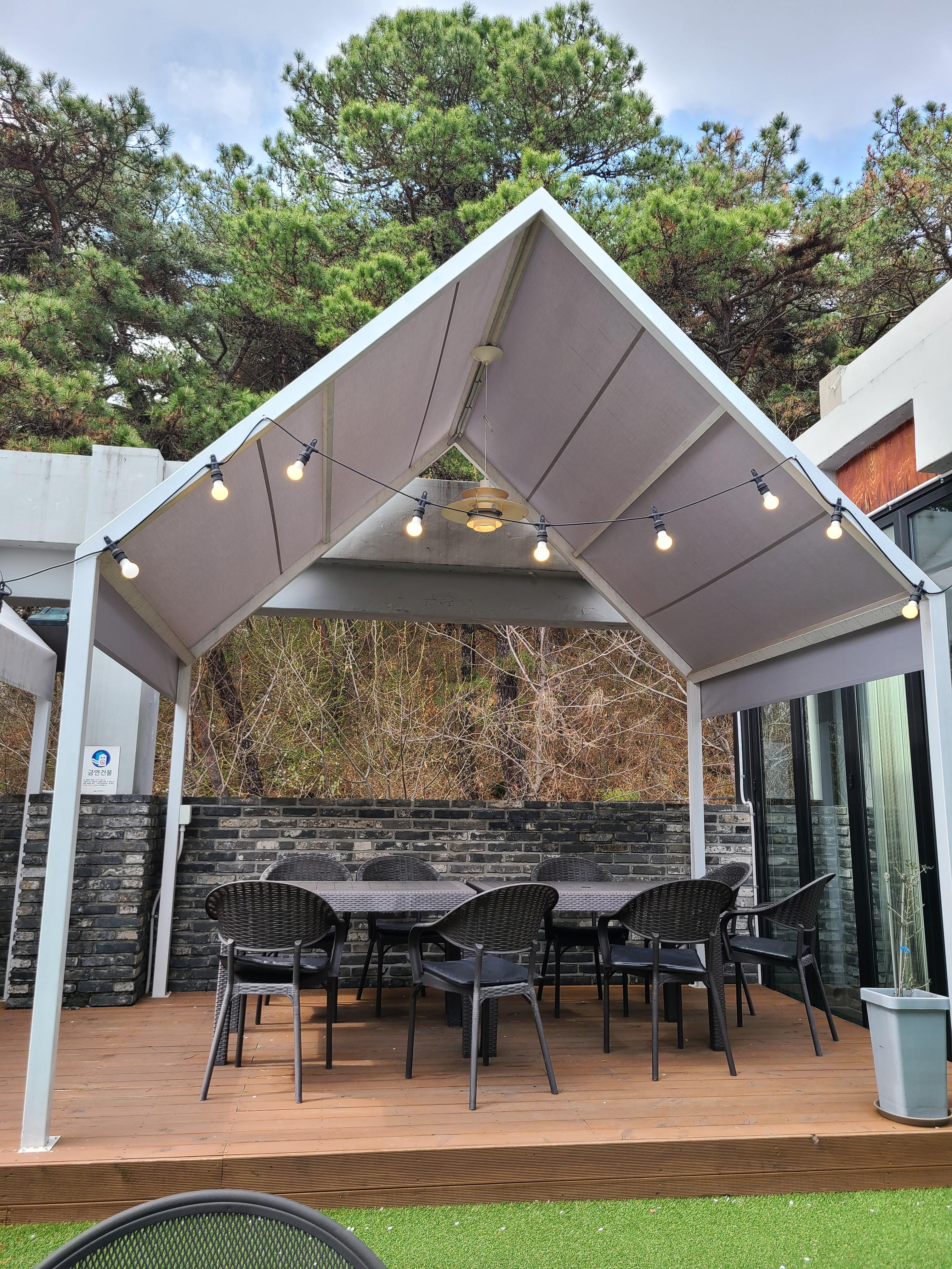 실내와 실외가 있어요. 춥지 않다면 비가 오는 날에도 비를 맞지 않는 실외에서 드시는 것을 추천합니다.