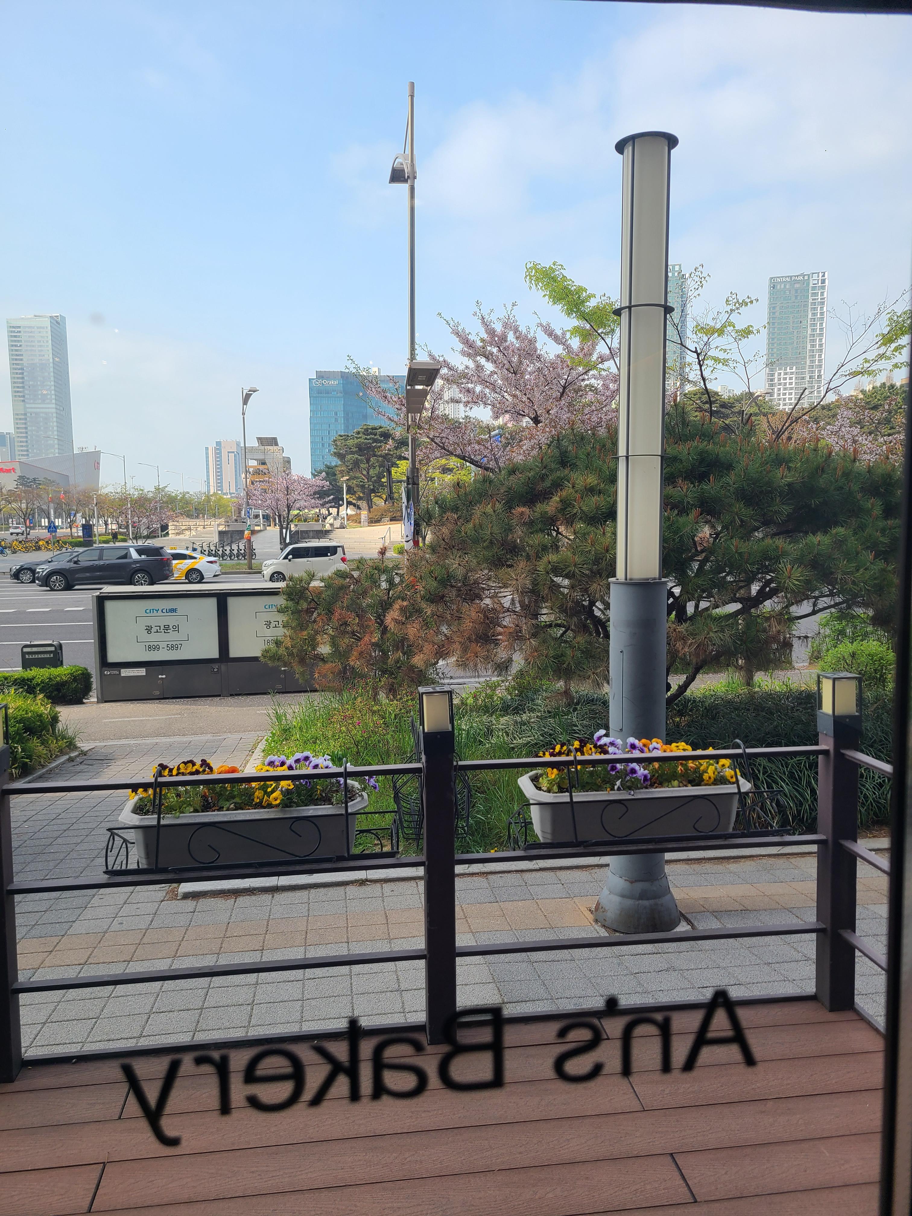내부에서 창밖을 본 것입니다. 저는 창밖이 보이는 곳에서 앉아서 커피와 함께 빵을 먹었습니다.