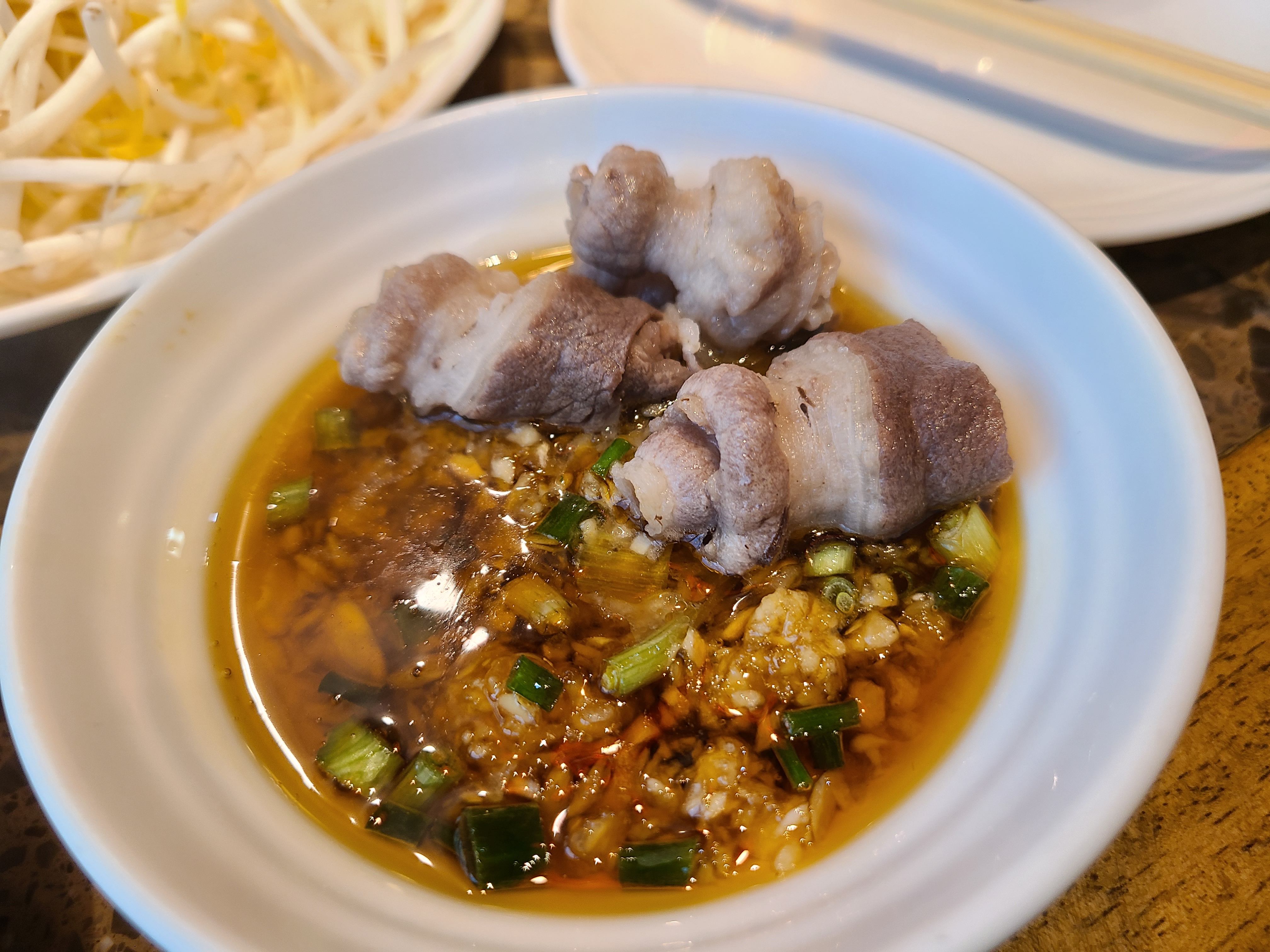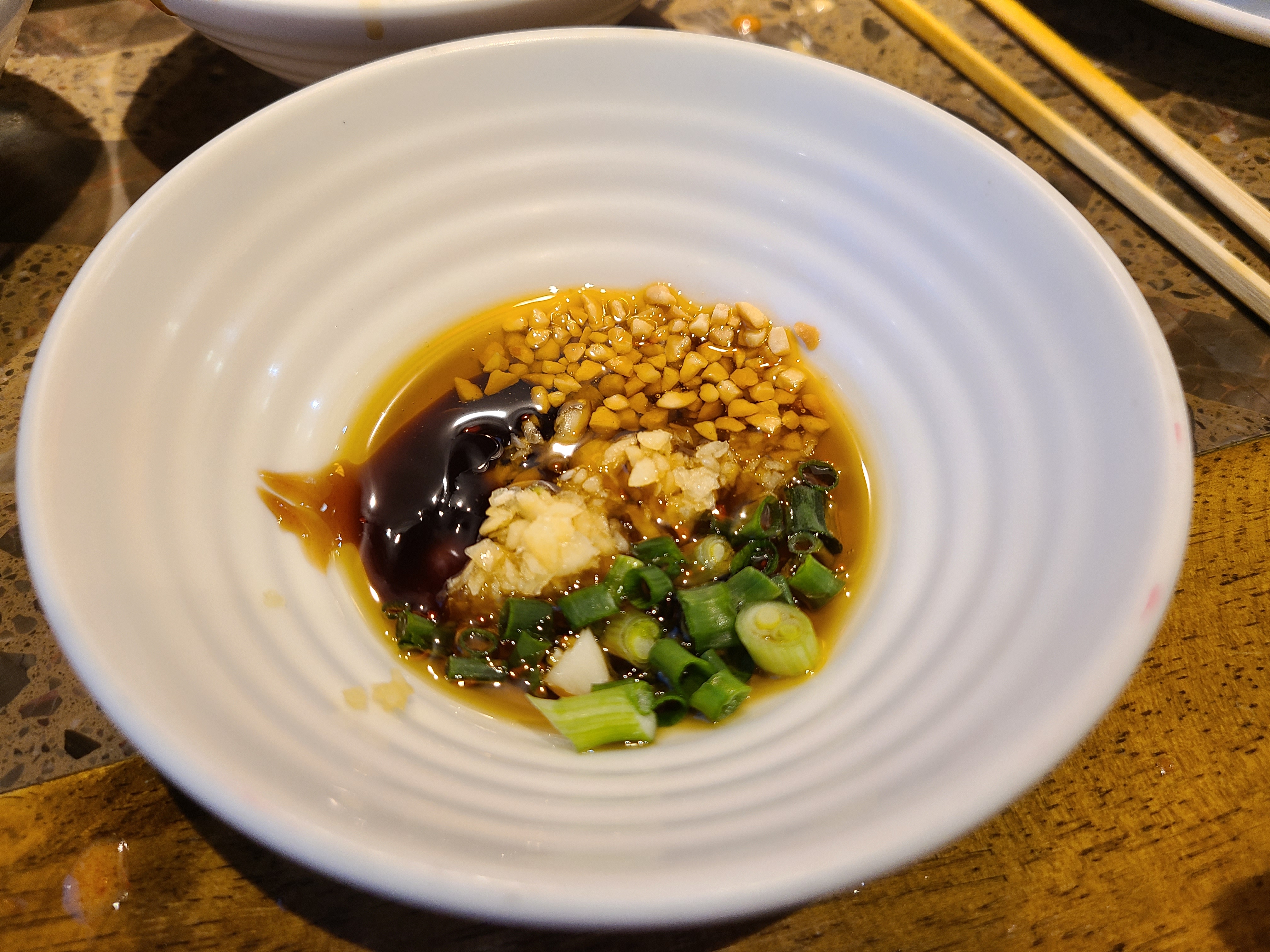 처음에는 이렇게 소스를 만들어 먹었습니다. 중간에 있는 것은 주로 위쪽 (베이징)에서 옆에 있는 참기름+마늘 소스는 사천지역에서 먹는 스타일이라고 하더라고요. 함께 같이 간 중국분이 설명해 준 것입니다.