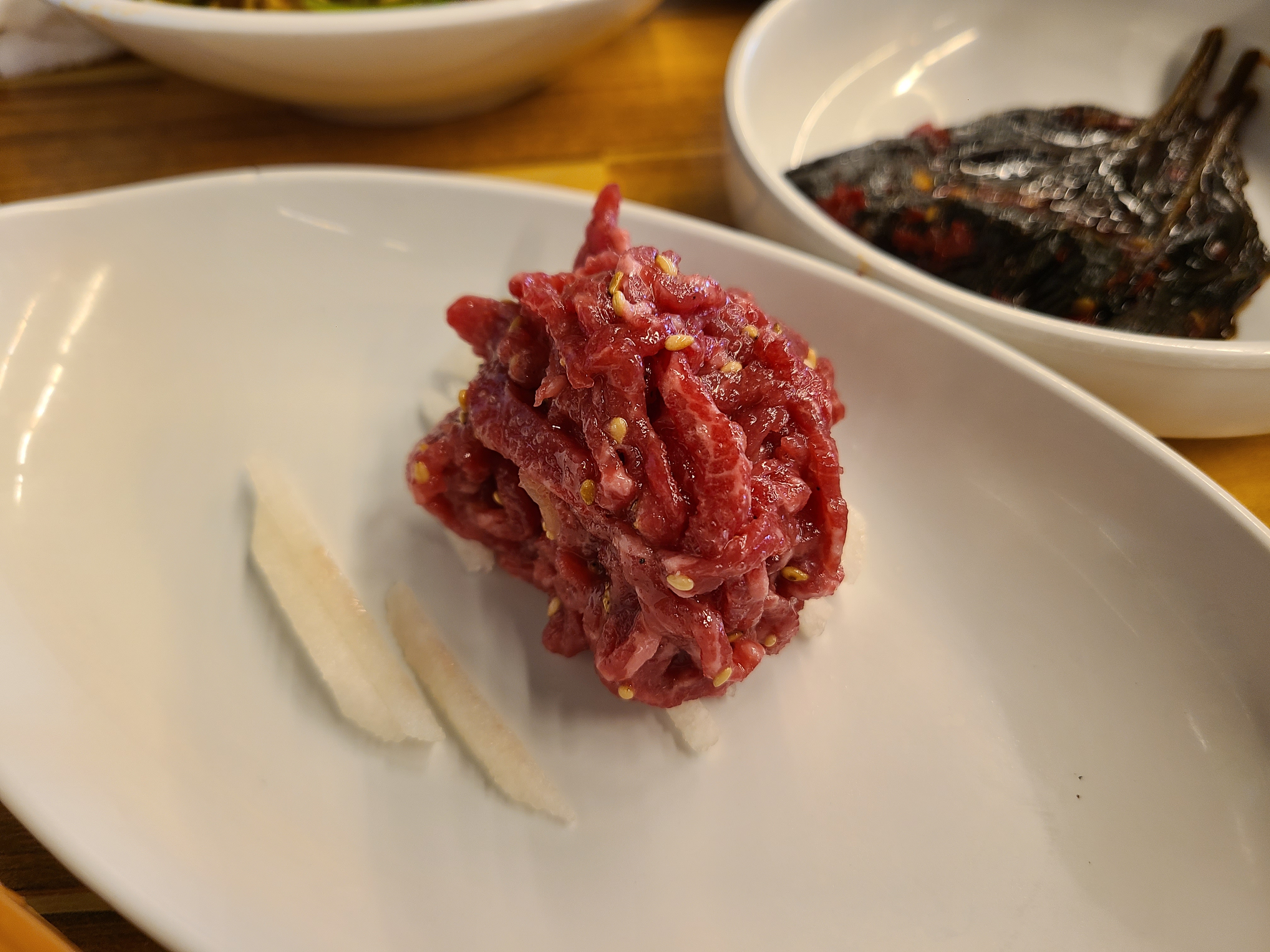 함께 나온 육회였습니다. 아주 고소했습니다. 많이 먹어보지는 못했지만, 먹어보았던 육회중에서 아주 좋은 편이었습니다. 조금 나와서 더 그런지 모르겠지만. 맛있었습니다.