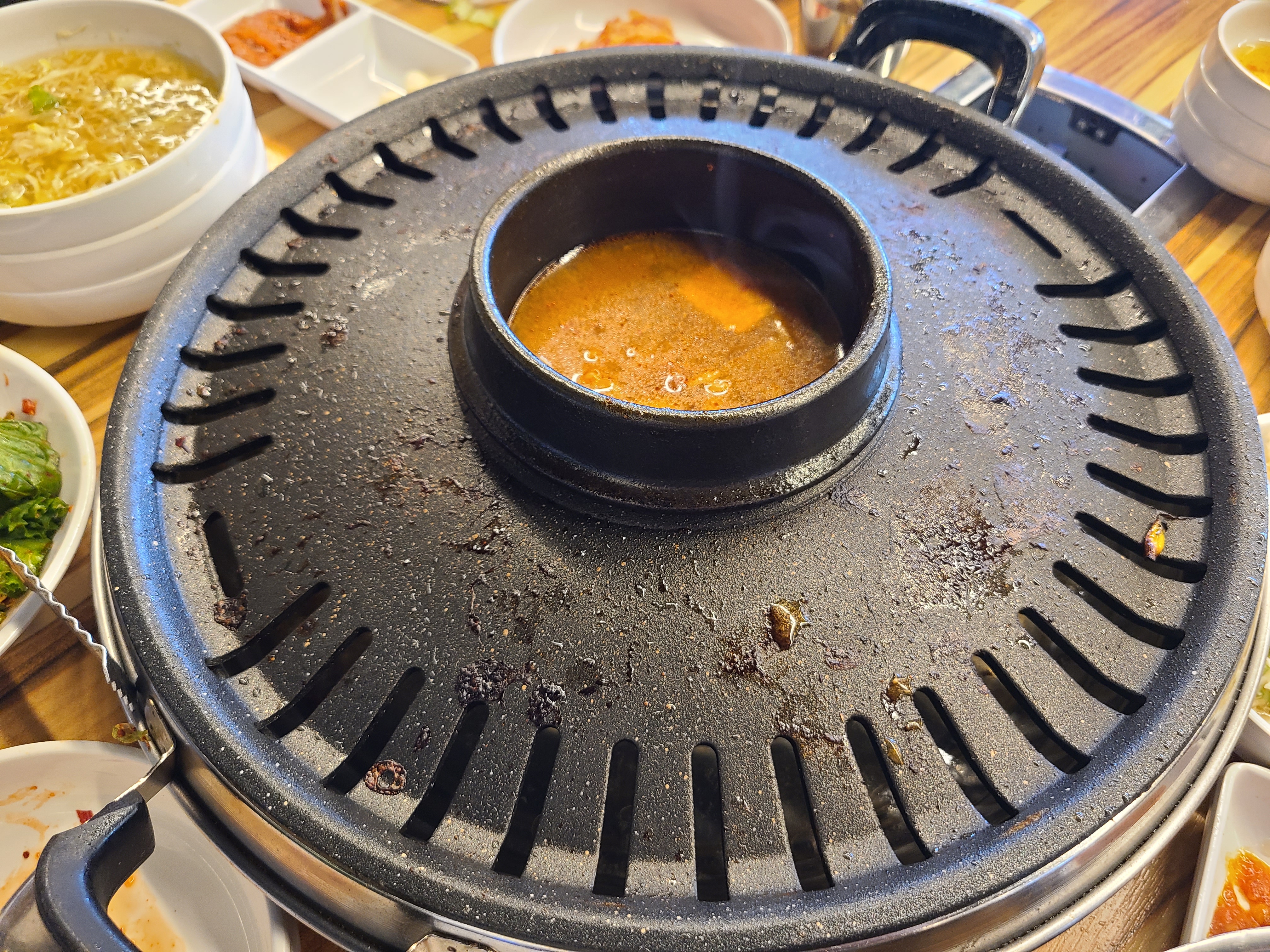 함께 나오는 된장국은 계속 보충해 주시고요.. 저희는 고급스럽게도 구워먹으라고 나온 우삼겹을 잘라서 된장에 넣었더니 된장도 아주 맛있었습니다. 너무 맛있어서 어쩔 수 없이(??) 밥 한 공기를 4명이 함께 나누어 먹었습니다.