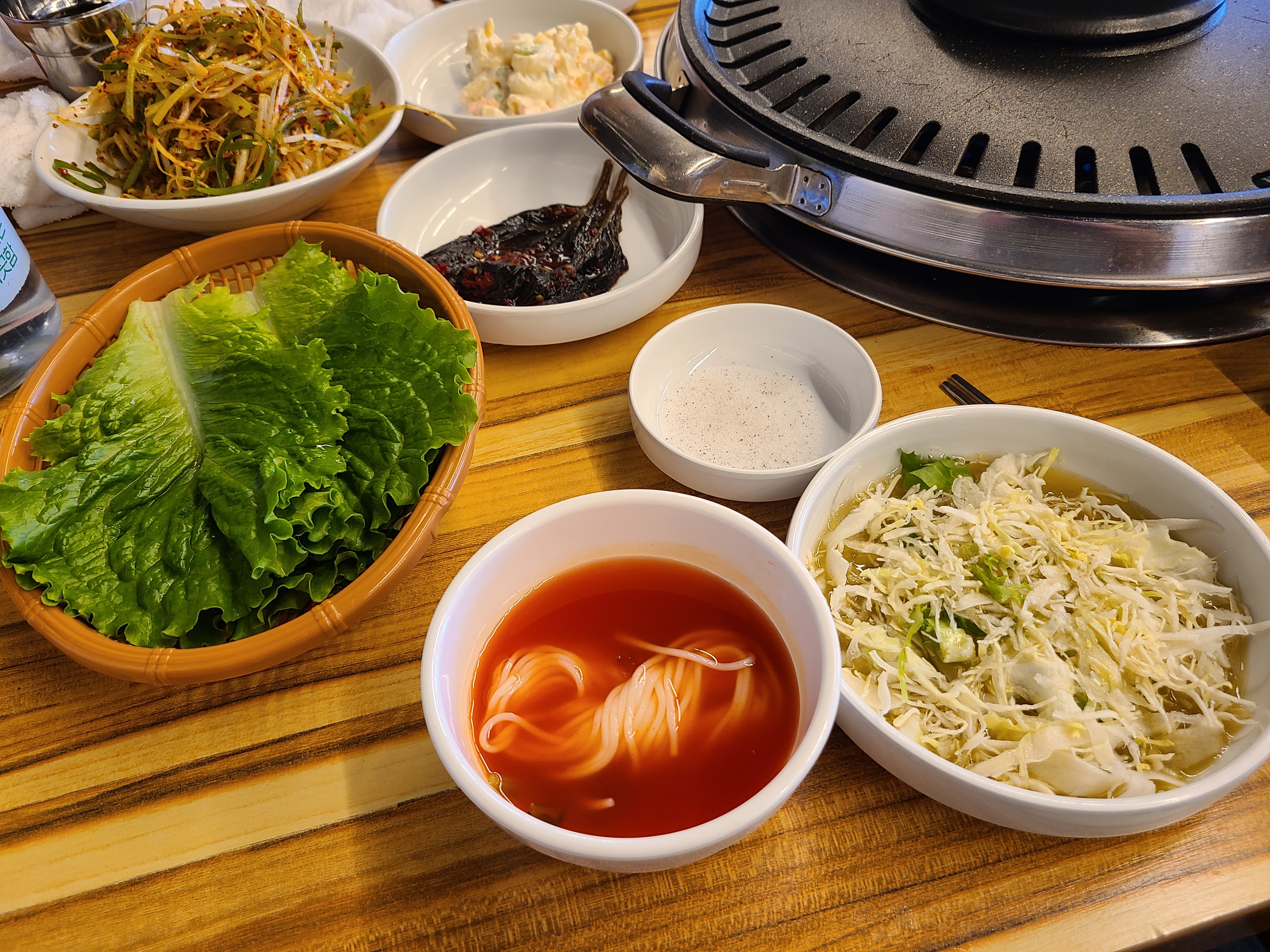 밑반찬입니다. 깻잎에 싸 먹어도 맛있고요.. 저는 소고기는 소금에 찍어 먹는 것을 좋아합니다. 귀한 소고기라서 야채와 같이 먹지 않고요.. 그냥 소금에 찍어 먹습니다. 함께 나온 국수인데 다른 분들은 모두 먹었지만, 저는 참았습니다. 소고기를 많이 먹으려고요..
