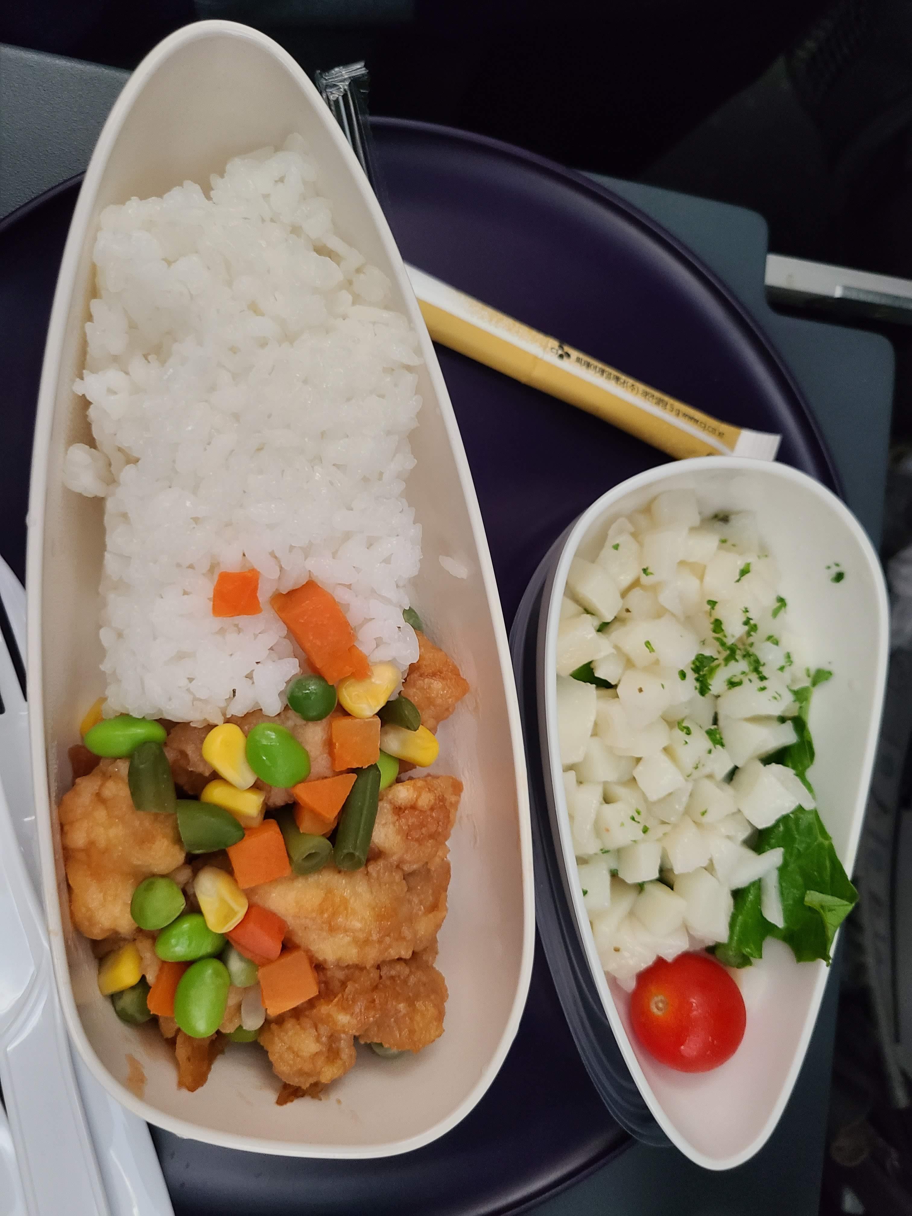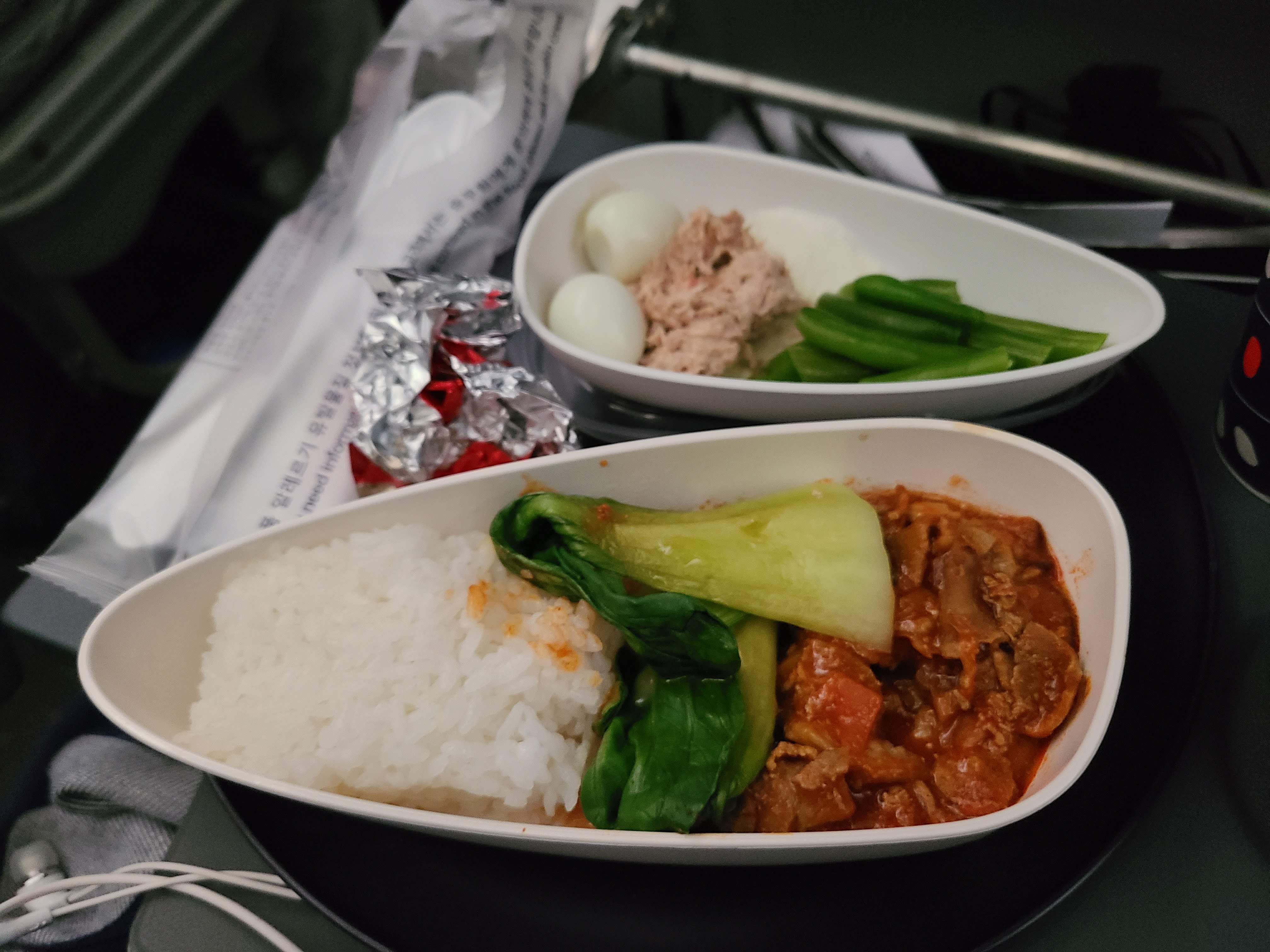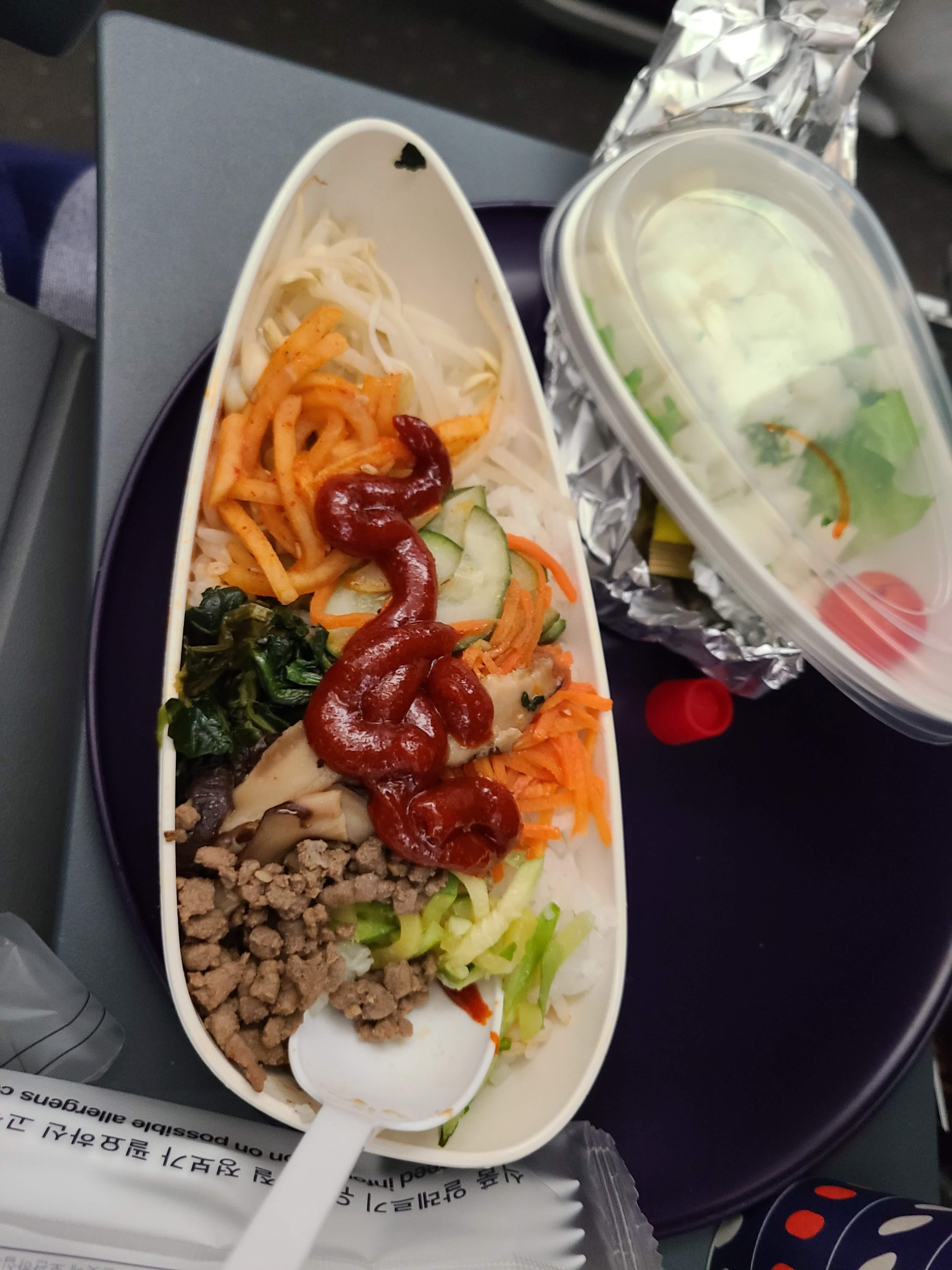 비행기를 타고 1시간 정도 후에 나온 첫 번째 식사입니다. 2가지 모두 괜찮았습니다. 대부분 비빔밥을 많이 먹더라고요.