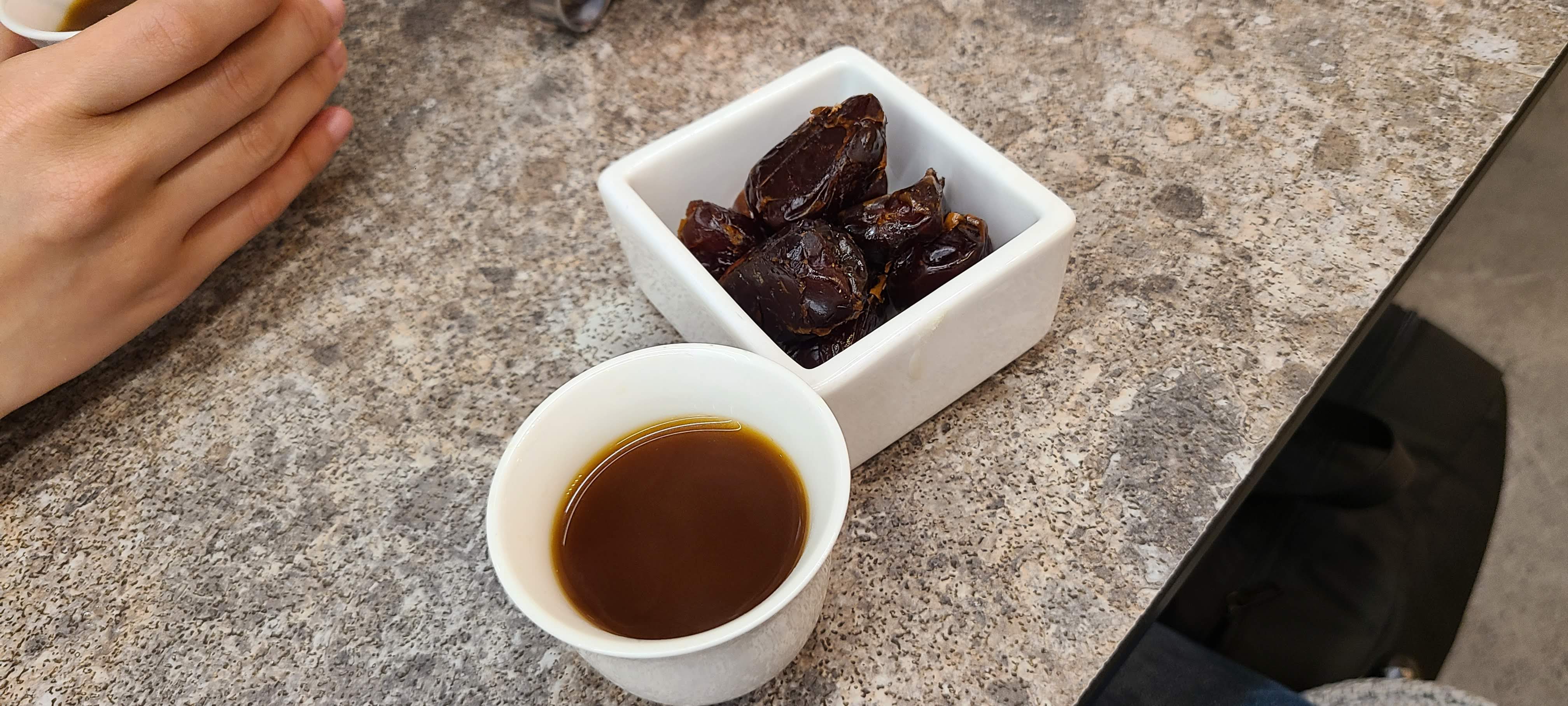 대추야자와 함께 나왔습니다. 진한 커피는 아니어서 연한 맛을 느낄 수 있었습니다. 또한 신맛이 강했습니다. 호불호가가 있는 것 같은데 저는 괜찮았습니다. 한잔을 시켰는데 이렇게 나오더라고요.. 3명이 갔는데 잔을 세 개 주는 센스까지..