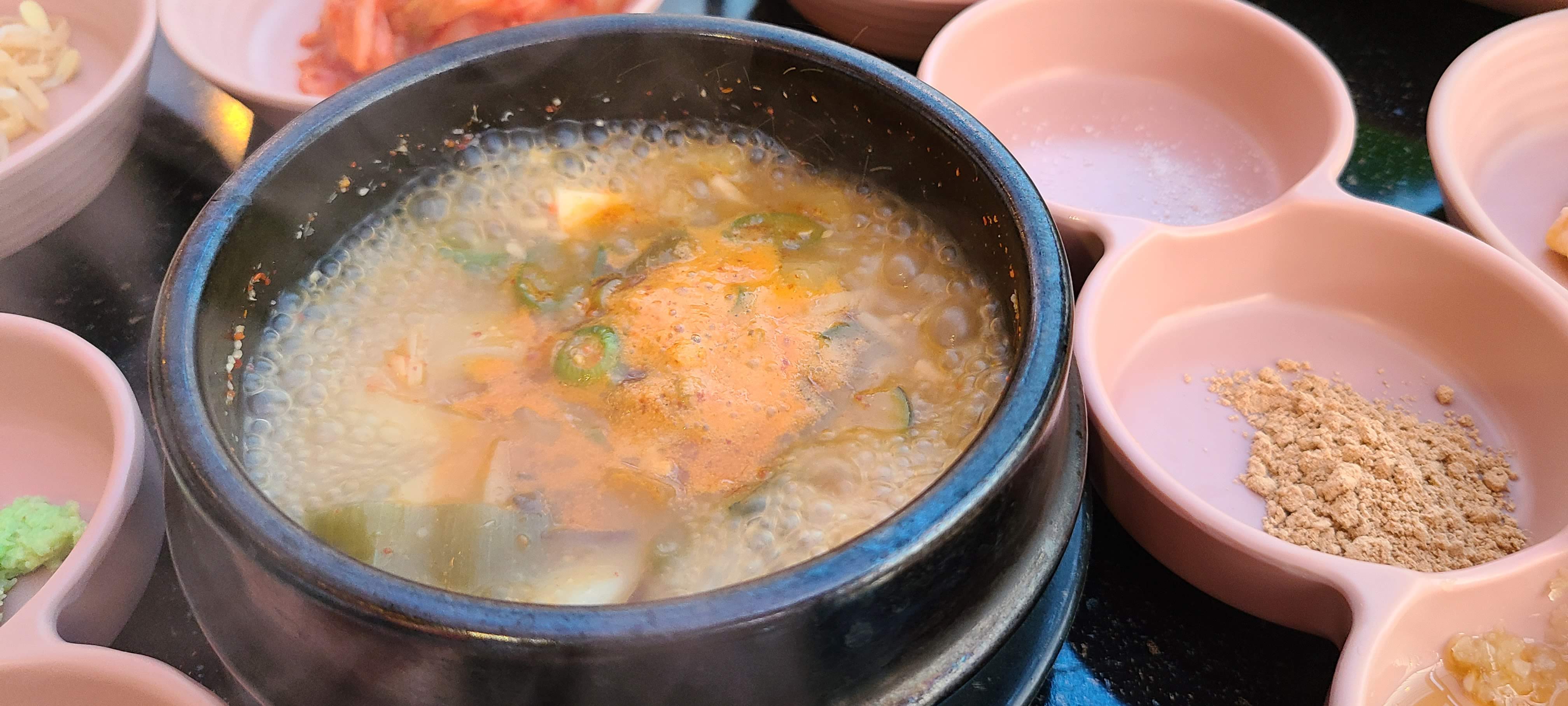 삼겹살등을 시키면 함께 나오는 된장찌개 맛있습니다. 된장찌개만 가지고 소주 한 병을 비울 수 있을 만큼의 맛입니다.