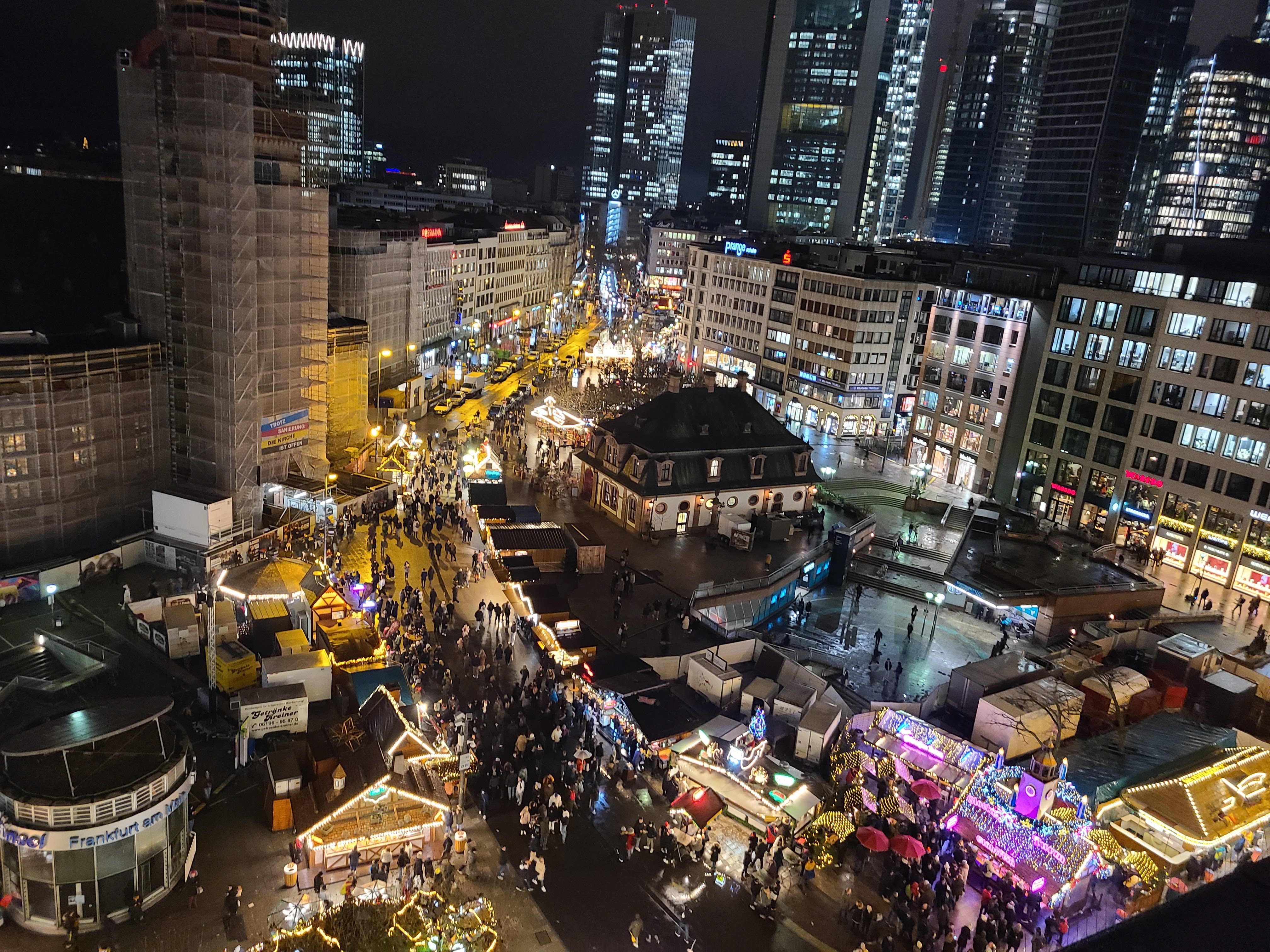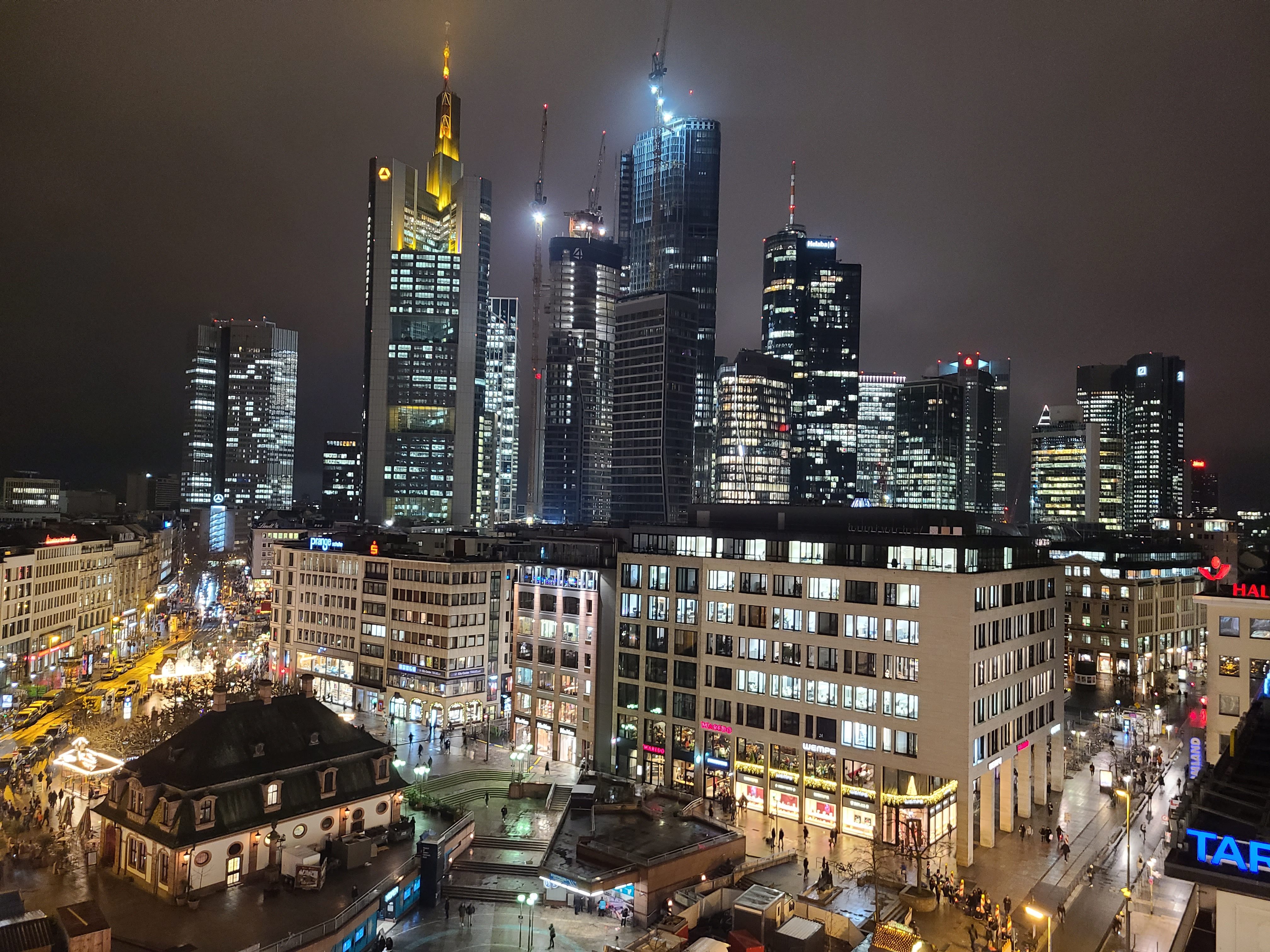 그리고 한 가지 팁으로는 쇼핑몰에 갤러리아 백화점 (Galeria frankfrut an der Hauptwache)이 있어요. 겔러리아백화점 꼭대기 층(8층?)은 음식점인데 밖으로 나와서 볼 수 있습니다. 들어가서 음식을 먹어도 되고요 먹지 않고 나와서 밖을 볼 수 있습니다. 돈을 쓰지 않고도 프랑크푸르크 야경을 볼 수 있어요^^ 특히 크리스마스 마켓의 야경을 볼 수 있습니다.