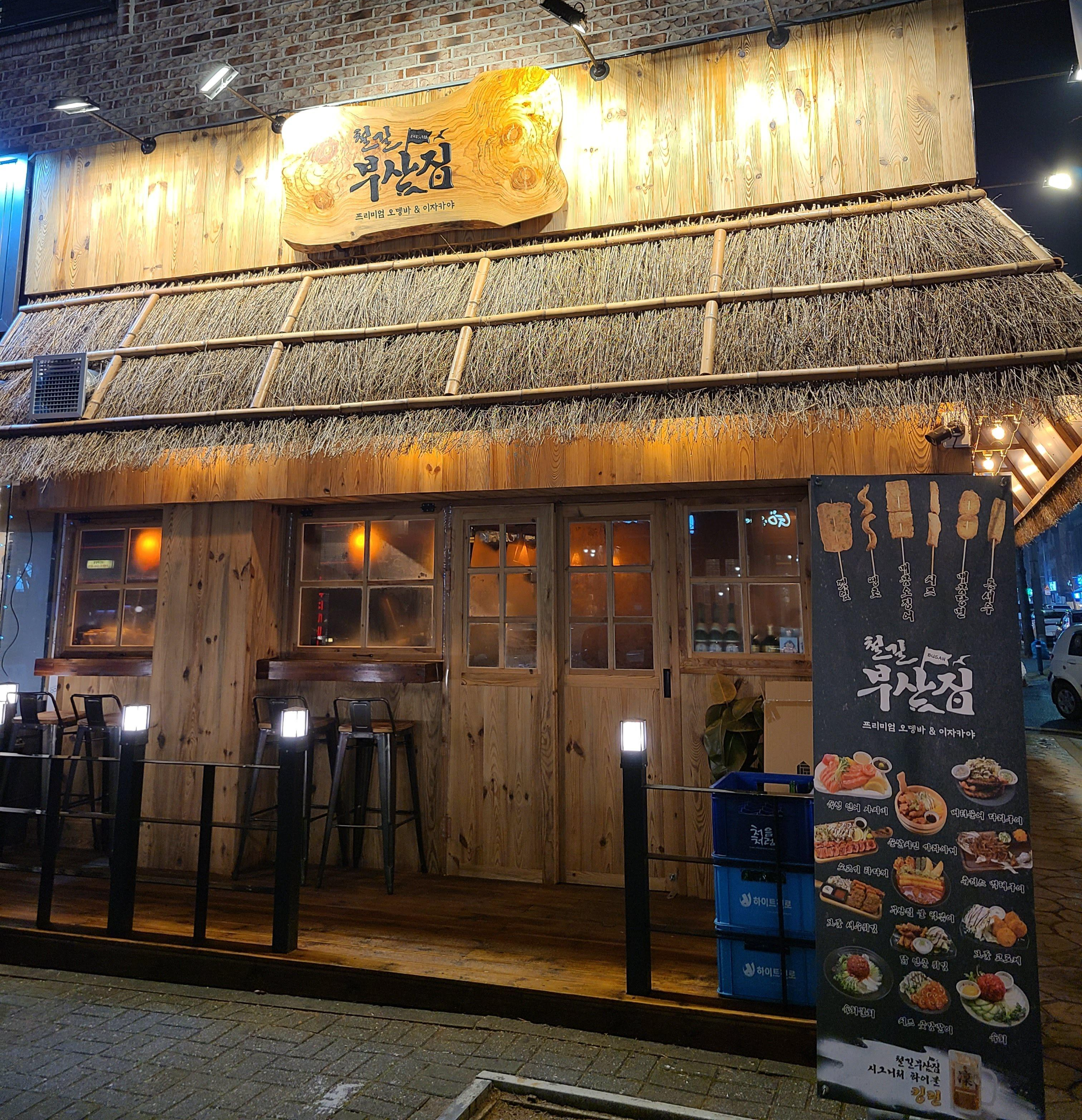 대전 관평동 위치한 철길부산집눈 오는 날 한잔하기 좋은 분위기 집입니다. 혼술 하거나 서로 마주 보면서 한잔하기 어색하거나 너무 친한 사이라면 바에 앉아 먹는 것도 좋을 듯... ^^ 창가의 자리에 앉아서 생맥주 한잔을 했습니다. 오뎅바 전문점이라 해운대세트 (어묵 2인 스페셜 + 메인요리(택1)) 을 했어요.메인요리는  순살치킨 가라야케를 했어요.참고로 세트는 서면세트 (어묵 + 숙성연어), 광안리 세트 (어묵 + 소고기타다끼 or 한우육회 or 숙성연어), 해운대세트 (어묵 + 메인요리(택1)) 이 있어요. 세트도 부산.. 서면세트보다 송정세트라고 했으면 어땠을까 하네요... 간단하게 술한잔 하기에 좋은 장소인 것 같네요...